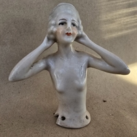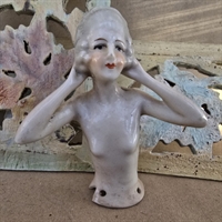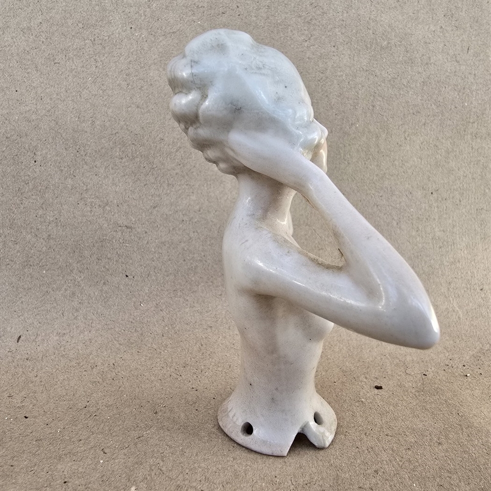 Denne halvdukke stammer fra en svunden tid og præsenterer en udsøgt rokoko frisure og arme, der er løftet op til ørerne, hvilket tilføjer et dramatisk og kunstnerisk udtryk til figuren.
