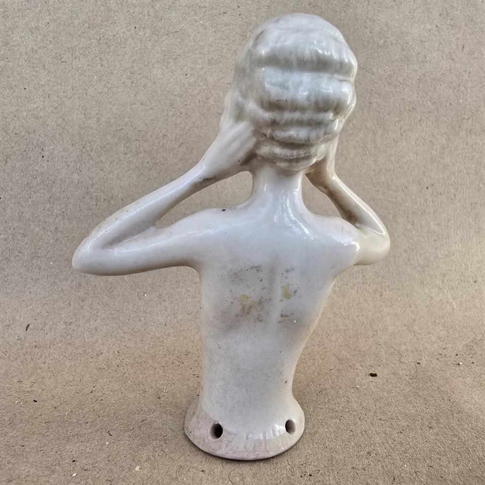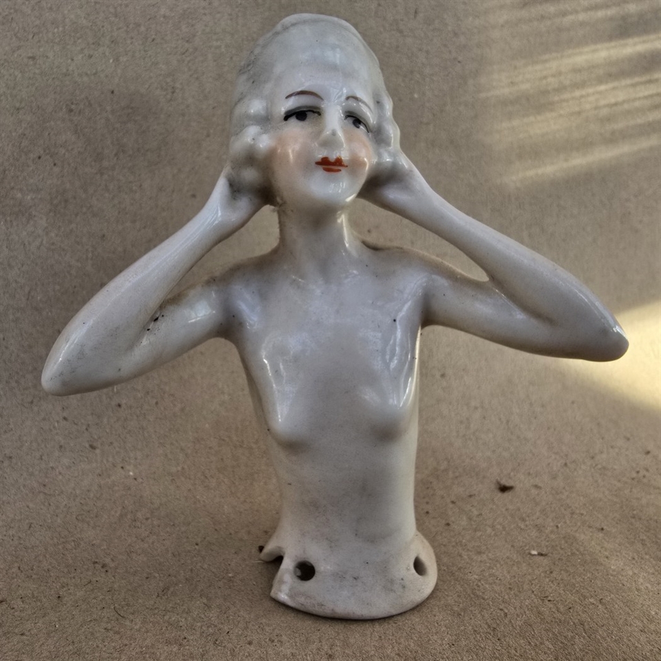 Dukkens detaljerede fremstilling inkluderer også nøje udformede bare bryster, et klassisk træk ved disse historiske samlingsobjekter.