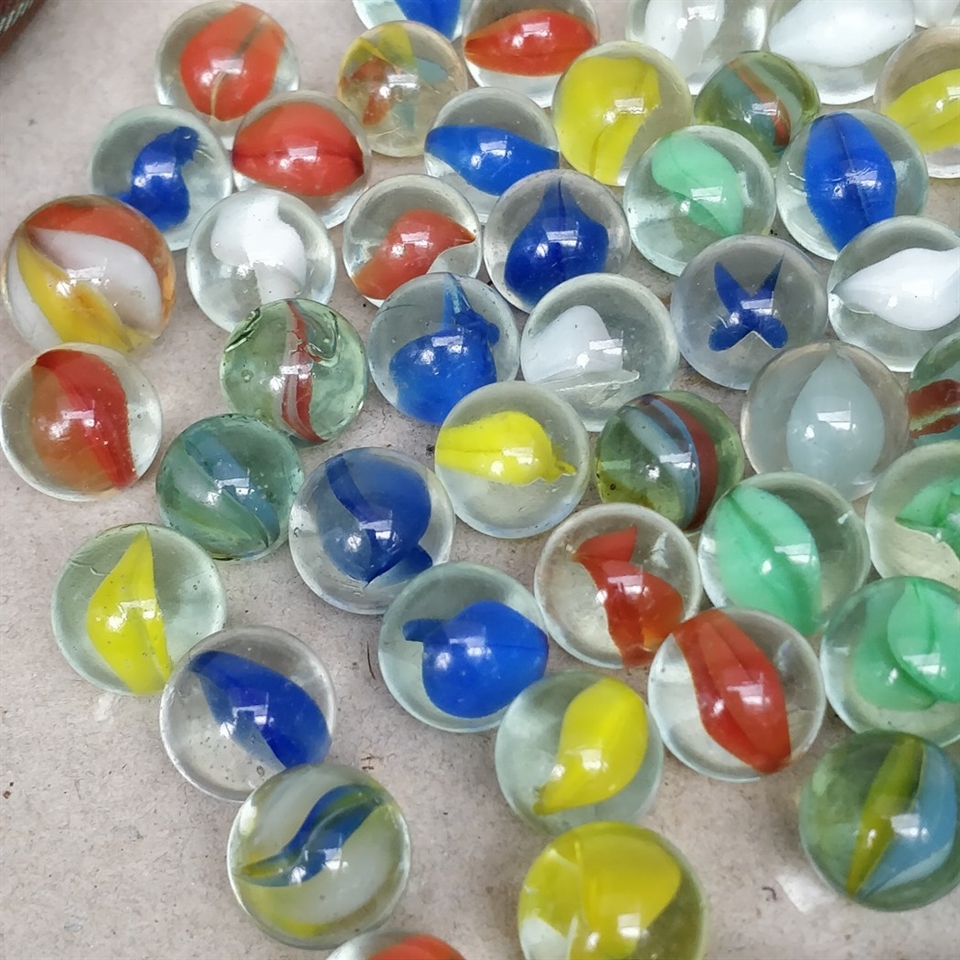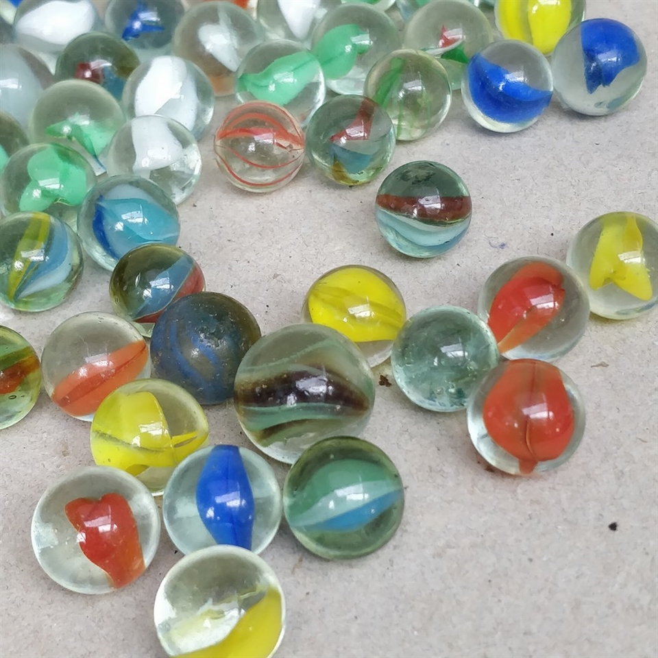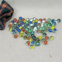 Opdag glæden ved nostalgi med vores "Posefuld gamle glaskugler i mange farver" – en charmerende samling af multifarvede glaskugler, præsenteret i en smuk ternet stofpose.