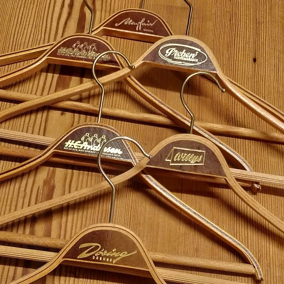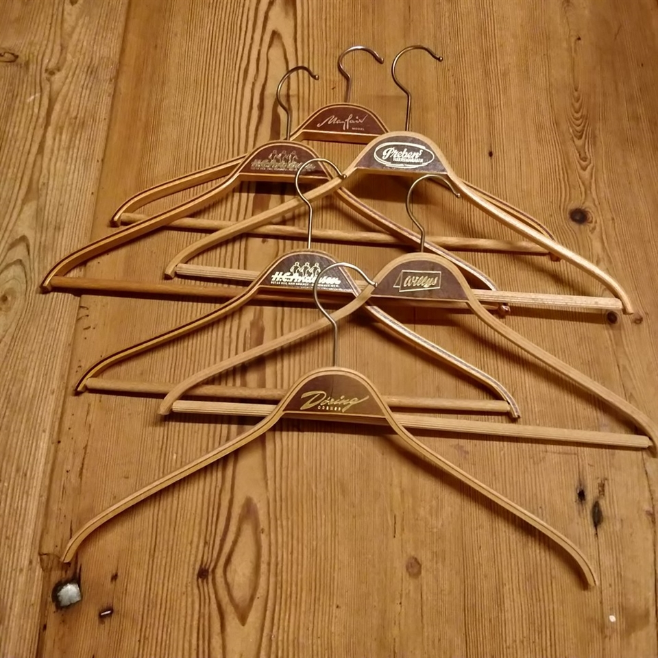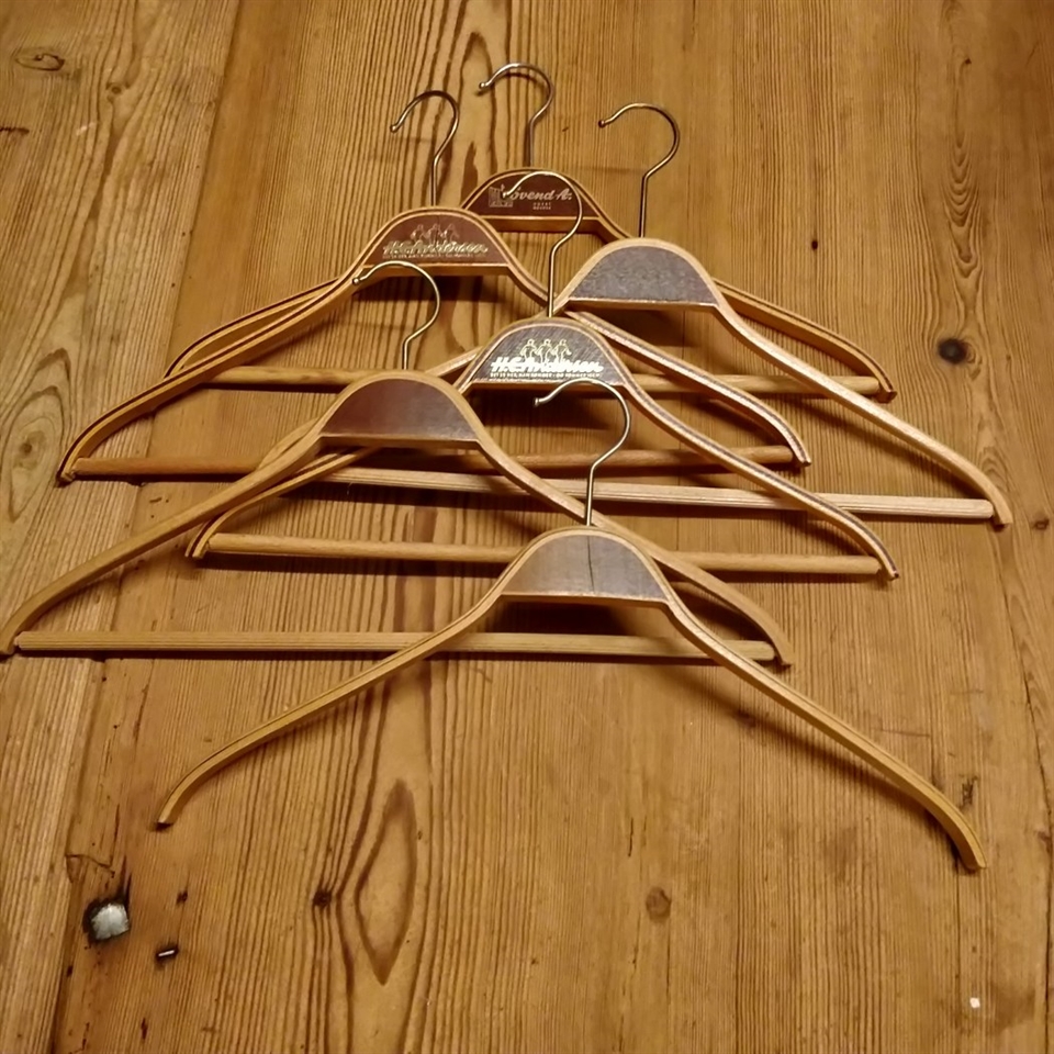 Opdag nostalgien med disse enestående reklamebøjler fra 'Prebens Herremagasin'! Dette sæt består af 6 unikke træbøjler, hver dekoreret med elegant guldtryk, der tilføjer et strejf af historisk charme til din garderobe.