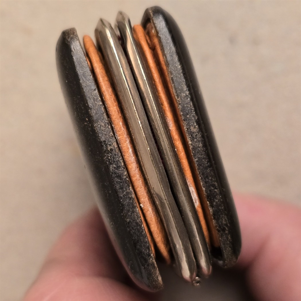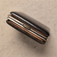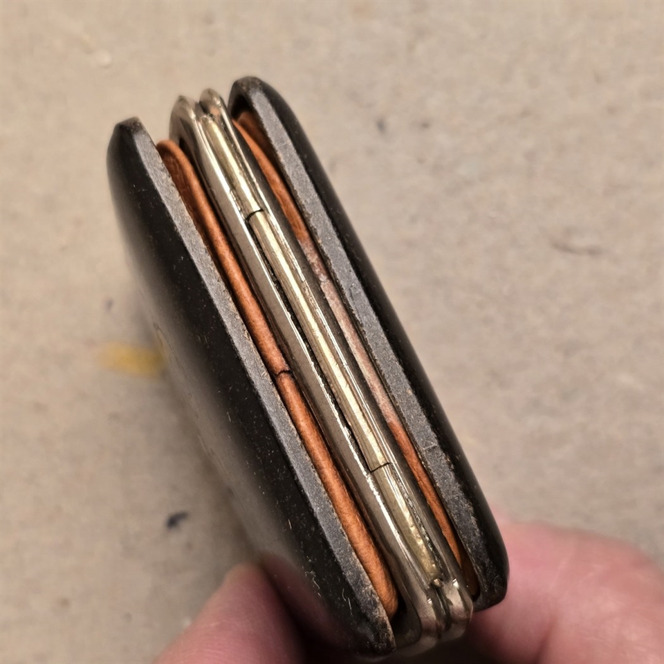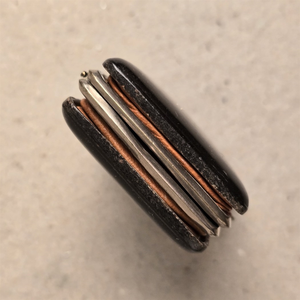 Opdag den charmerende elegance med denne antikke lille damepung, prydet med et iøjnefaldende R-monogram. Denne unikke pung, fremstillet i et eksklusivt skildpaddeskjoldsmønster med rødt foer, kombinerer vintage flair med praktisk design. Perfekt dimensioneret til at bære dine nødvendigheder, måler den kun 6,5 x 5 cm. og er 2 cm. tyk, hvilket gør den ideel til både daglig brug og særlige lejligheder.