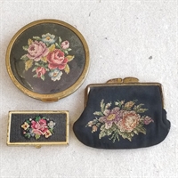Vores eksklusive sæt her, består af en pung, en pilleæske og en rund pudderdåse, alle omhyggeligt dekoreret med petit point broderi.