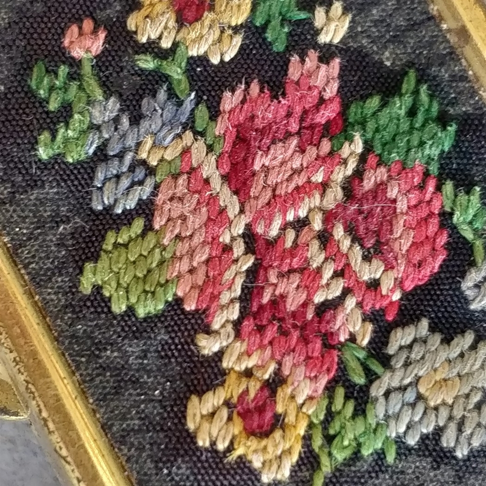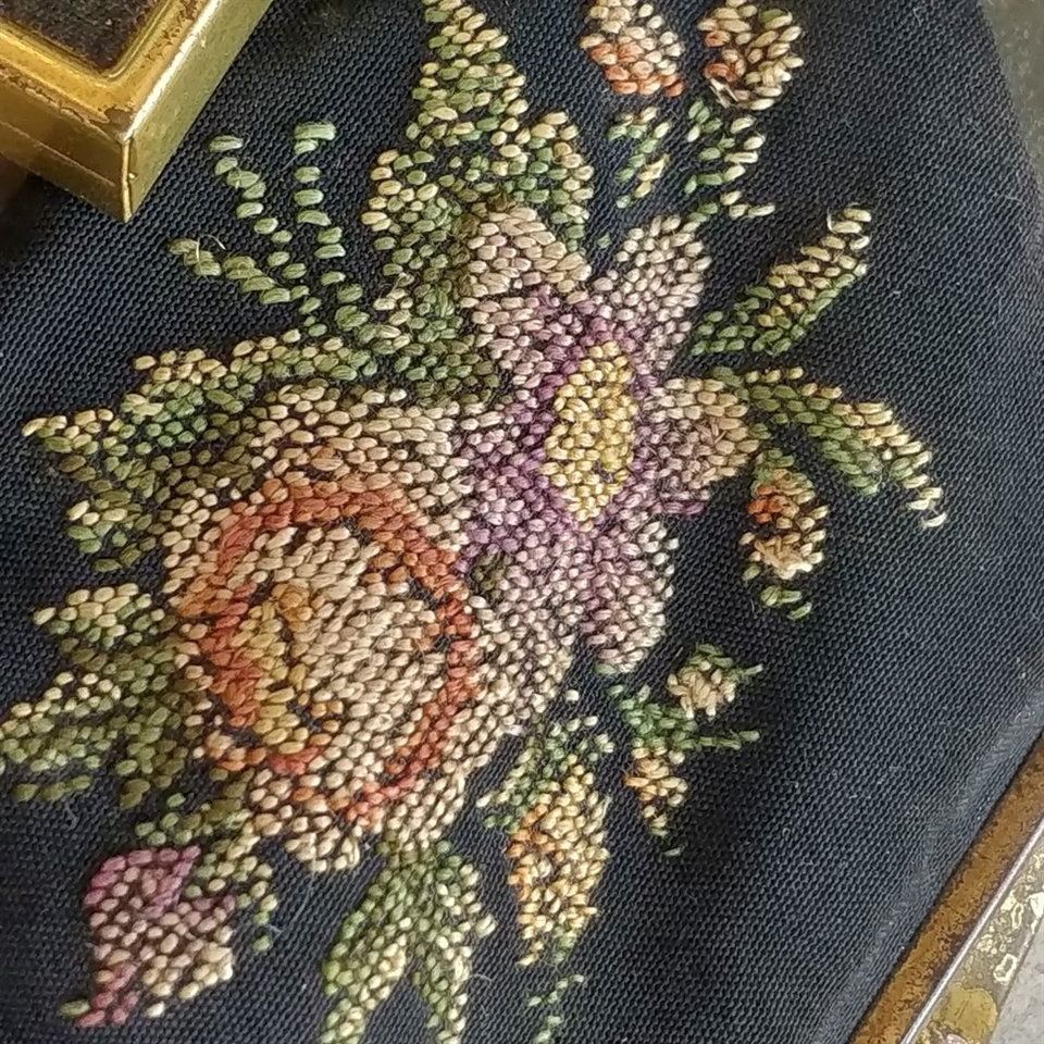 Produktdetaljer: - **Navn:** Rosen dekoreret pung, pilleæske og rund pudderdåse, petit point broderet - **Antal dele:** 3 - **Materiale:** Pungen og æskerne er udsmykket med detaljeret petit point broderi, der fremviser fine rosenmotiver. - **Funktioner:** - **Pung:** Udstyret med en solid messinglukning, der sikrer dine værdigenstande. - **Pilleæske:** rektangulær form, perfekt til opbevaring af små nødvendigheder. - **Pudderdåse:** Rund form med en diameter på 8 cm., ideel til opbevaring af pudder eller små smykker. - **Stil:** Vintage, perfekt til at tilføje et touch af retro elegance til din hverdag eller til specielle lejligheder.