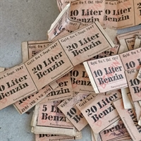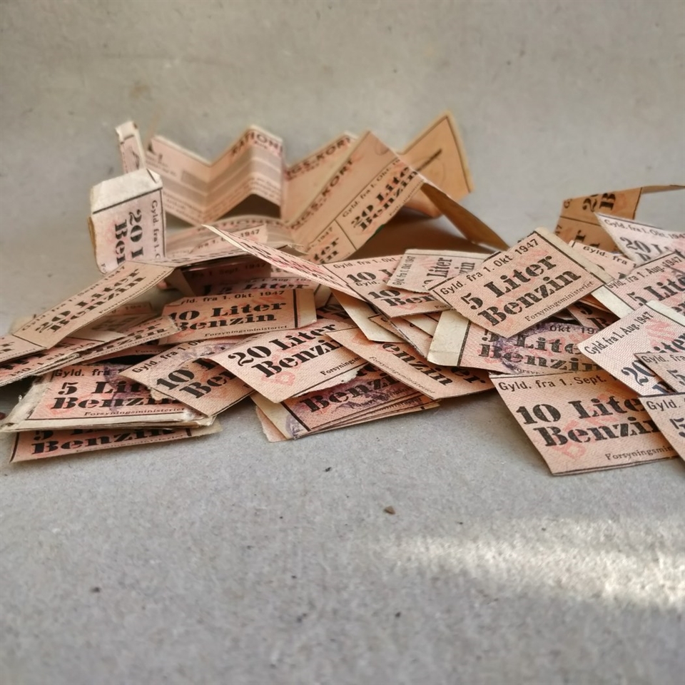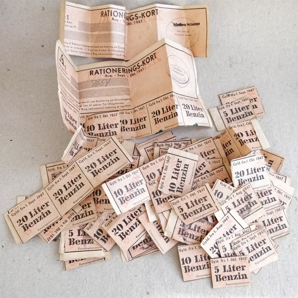 Opdag et stykke historie med 'Rationeringsmærker for benzin, September 1947'.