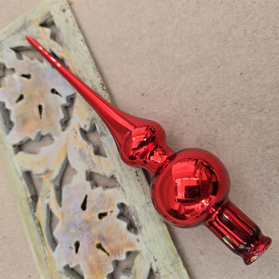 Dette smukke topspir er omhyggeligt udformet i glas og stråler med sin klassiske røde farve, der tilfører en ægte vintage følelse til din juledekoration.