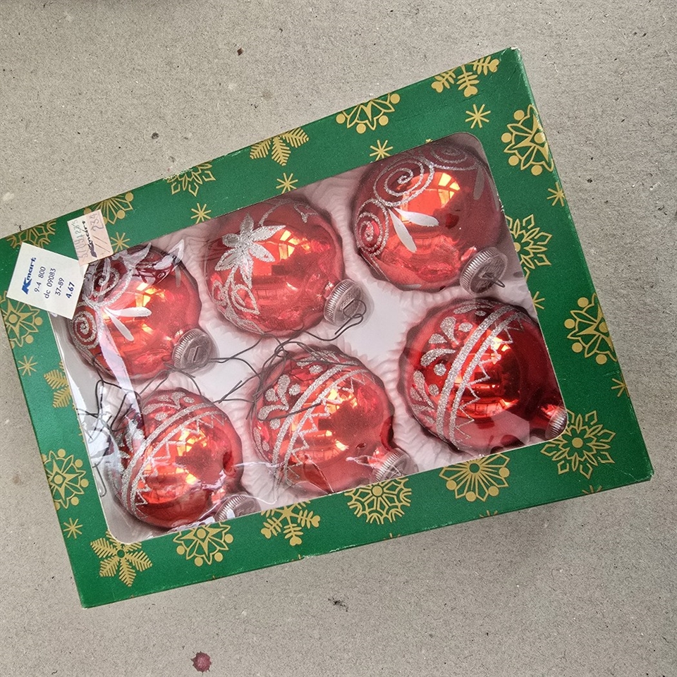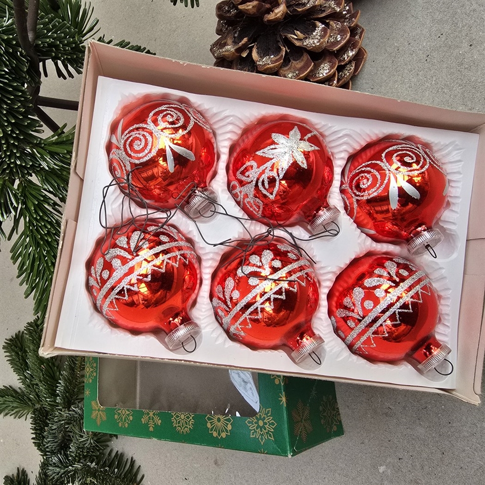 Opgrader dit juletræ med et strejf af vintage charme med vores sæt af 6 stk. 'Røde med sølvblomster gamle glas julekugler'.
