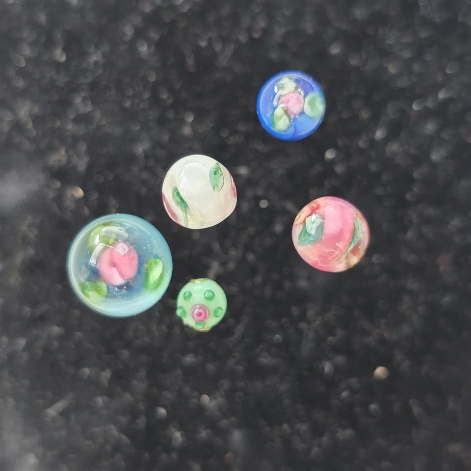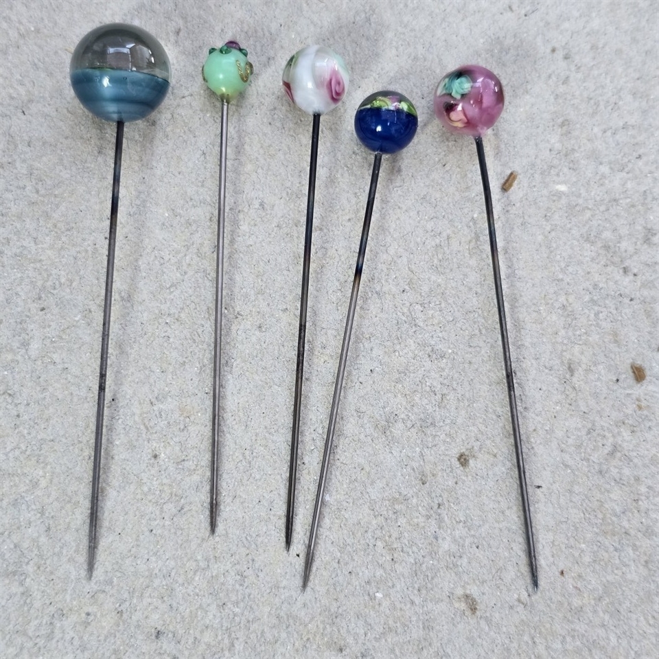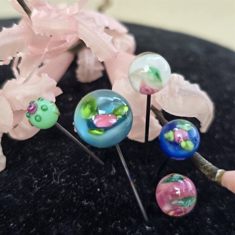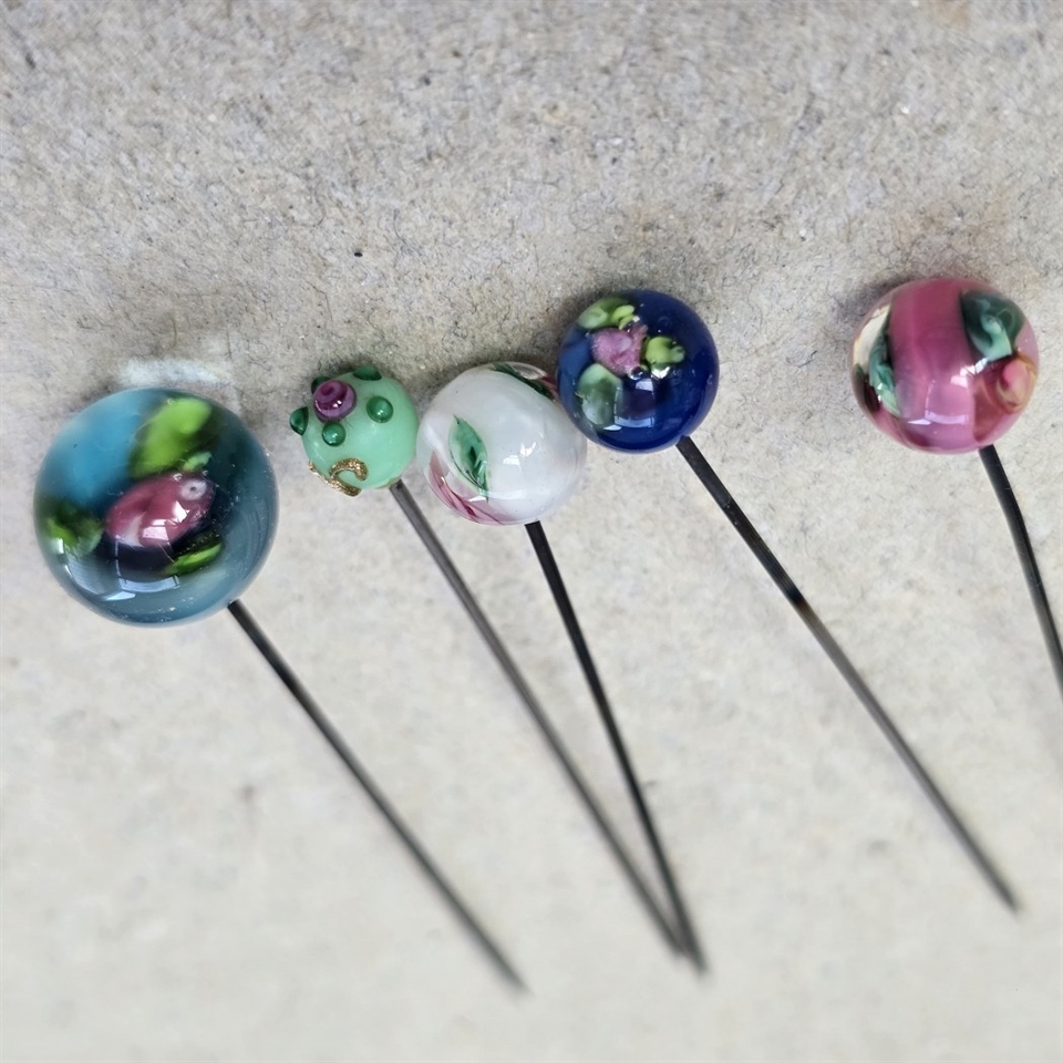 Rosendekorerede gamle glas nipsenåle, samlerobjekter.