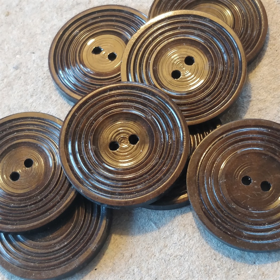 Brug genbrug, i dit håndværks projekt eller tøj med disse charmerende 'Runde med stribeeffekt knapper i brun plastik'.