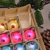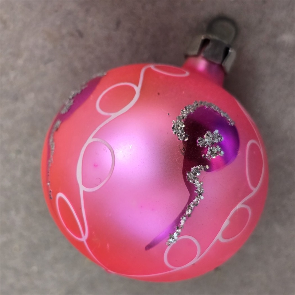 Dette sæt består af 8 unikke glaskugler, hver især omhyggeligt dekoreret med en blanding af hvid, pink og rød glimmer, der tilføjer et strejf af gammeldags glamour og festlighed til din juleudsmykning.