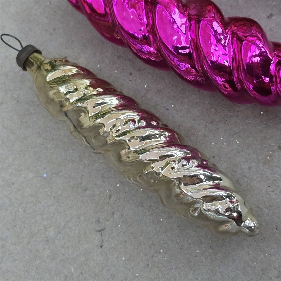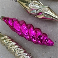 Disse betagende juletræskugler bringer en nostalgisk charme ind i dit hjem med deres unikke, snoede design og en fortryllende blanding af pink, guld og sølvfarver.