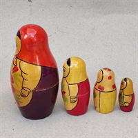 Sættet indeholder fire håndmalede trædukker, der passer ind i hinanden, hver med sit unikke og detaljerede design.