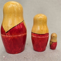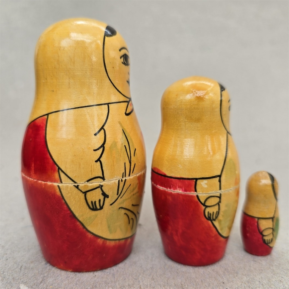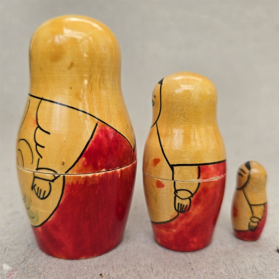 Sættet består af 2 delelige trædukker og en massiv, hvor den største måler 9 cm. i højden.