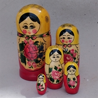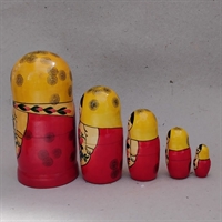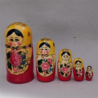 Sættet består af 5 babushka dukker, der elegant kan gemmes indeni hinanden. Fra den mindste på 4,6 cm. til den største på 17,6 cm., tilbyder disse babushkaer en fascinerende visuel og fysisk oplevelse, der ikke kun er dekorativ, men også sjov at interagere med.