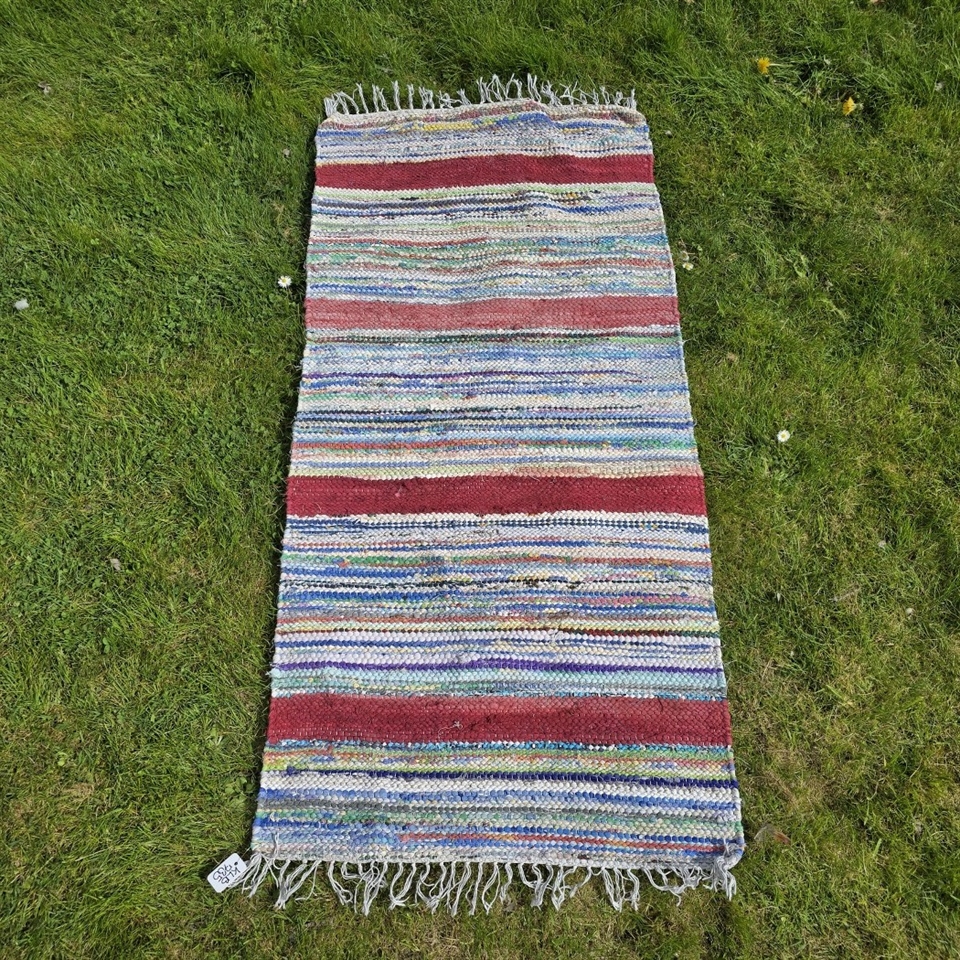 Opdag charmen og varmen i et vintage svensk kludetæppe med dette unikke 'Rust og multifarvede striber' tæppe.