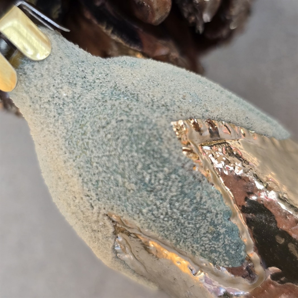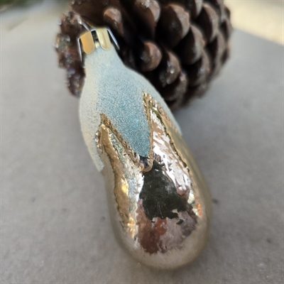 Denne enestående juletræsdekoration er omhyggeligt håndlavet i glas og færdiggjort med en delikat, sart rosa farve og en glitrende sukkertop, der reflekterer julelysenes varme glød.