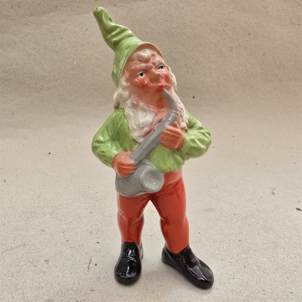 Denne charmerende gamle keramiknisse bringer et musikalsk twist til din juledekoration.