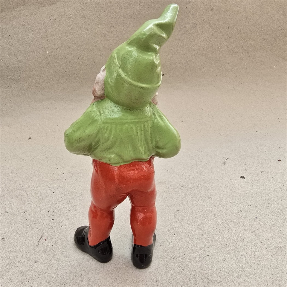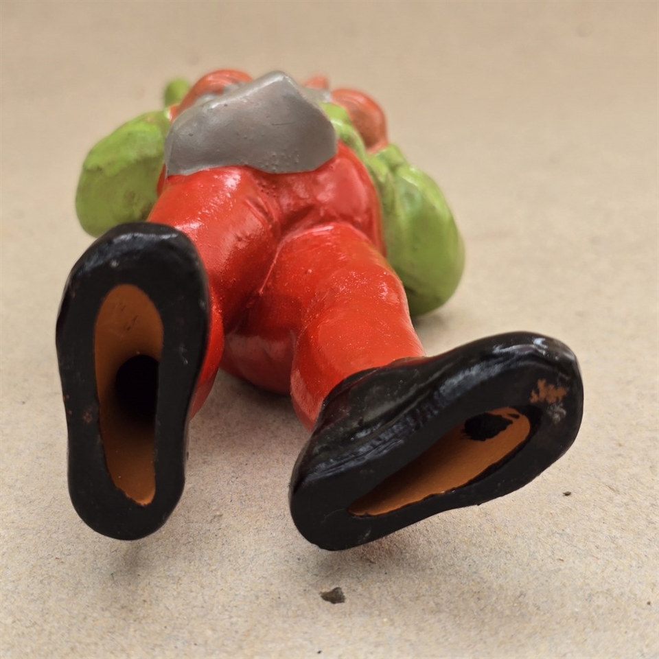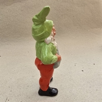 Med sin livlige lysegrønne hue og jakke kombineret med sprudlende røde bukser, er denne nisse en fryd for øjet.