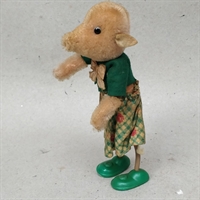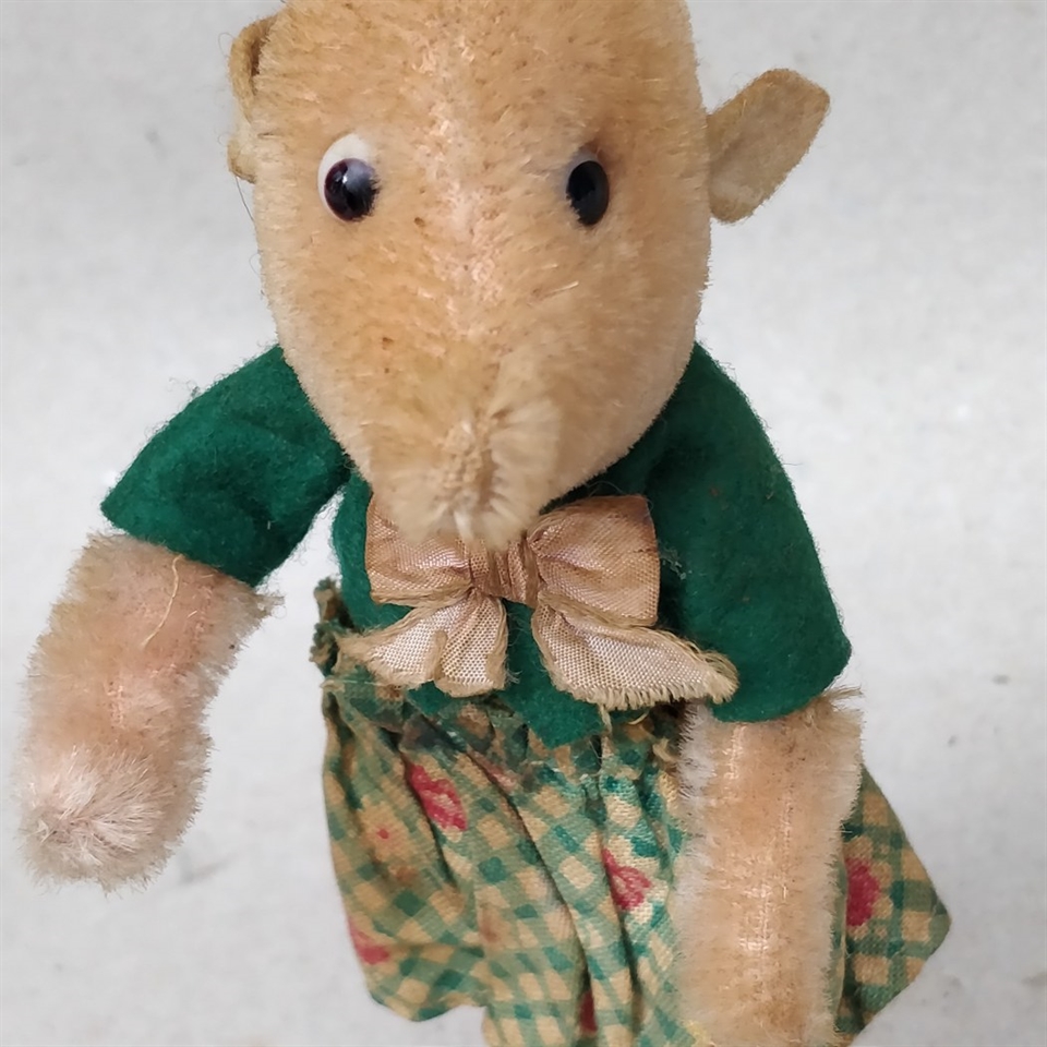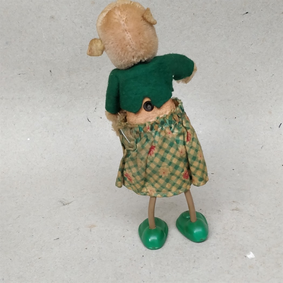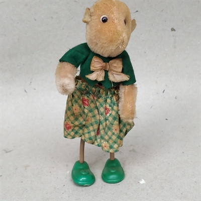 Denne nostalgiske mus er klædt i grønt tøj og matchende sko, hvilket tilføjer et farverigt og livligt touch til dens udseende.