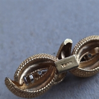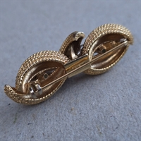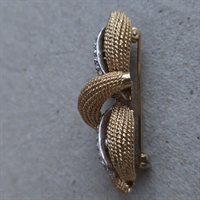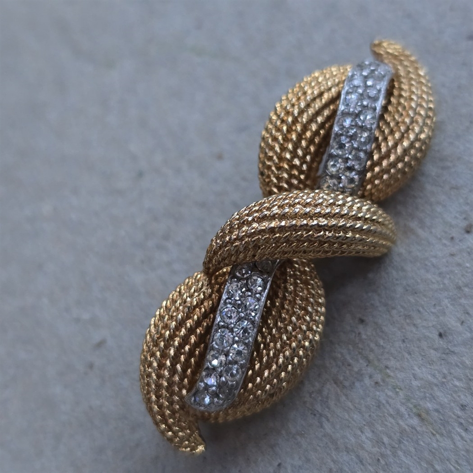 Vores vintagebroche måler 5,5 cm. i længden og er udsmykket med en forførende guldfarvet sløjfe, der elegant indrammer de funklende simili-sten. Hver sten er omhyggeligt indfattet for at maksimere lysrefleksionen og give et spektakulært glimt, der tilføjer et strejf af glamour til enhver lejlighed.