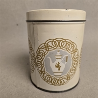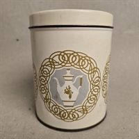 Dåsen er udsmykket med elegante guld- og gråtonede dekorationer, og dens runde form måler 14 cm. i højden og 11 cm. i diameter, hvilket gør den til en ideel størrelse for opbevaring af kaffe eller andre køkkenessenser.