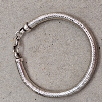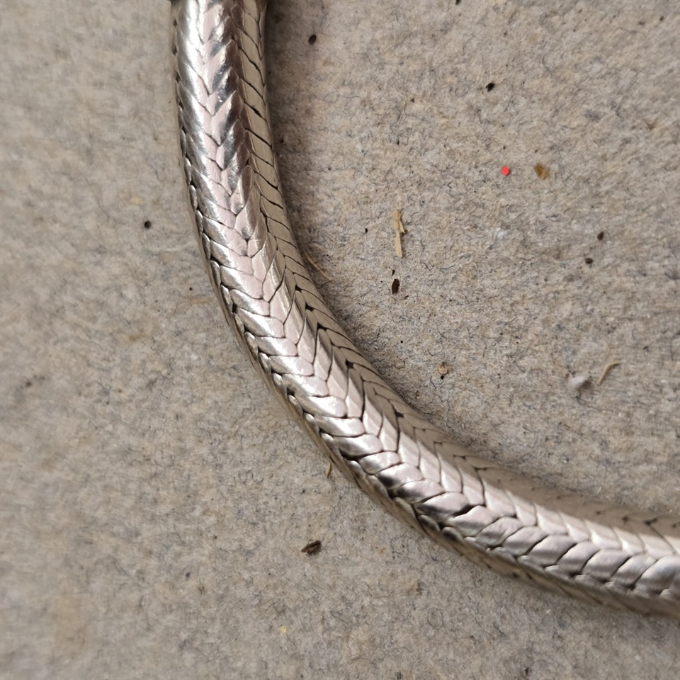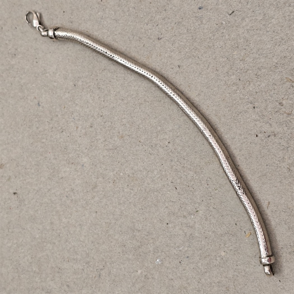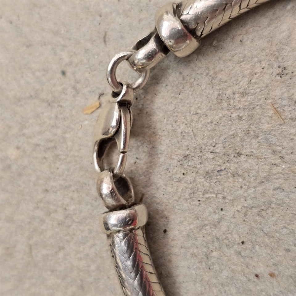Oplev en tidløs elegance med vores 'Slange sølvfarvet gammelt armbånd, karabin lås', et unikt stykke vintage smykkekunst, der tilfører et strejf af sofistikation til enhver garderobe.