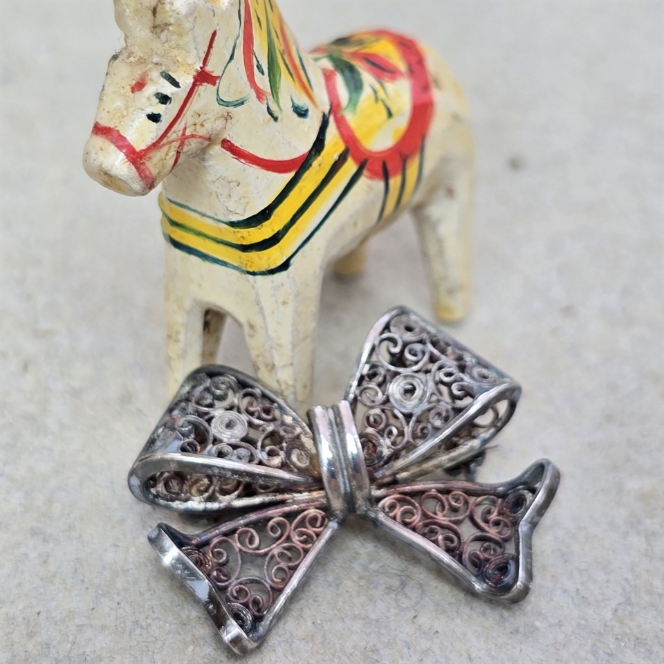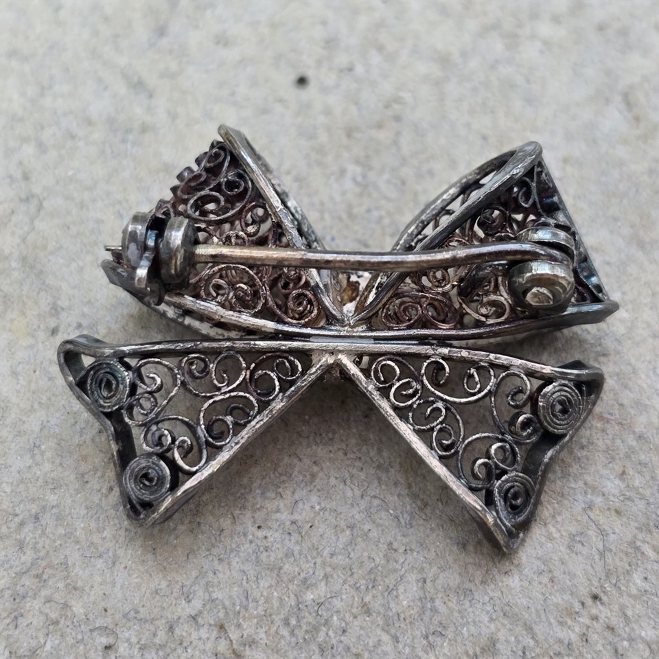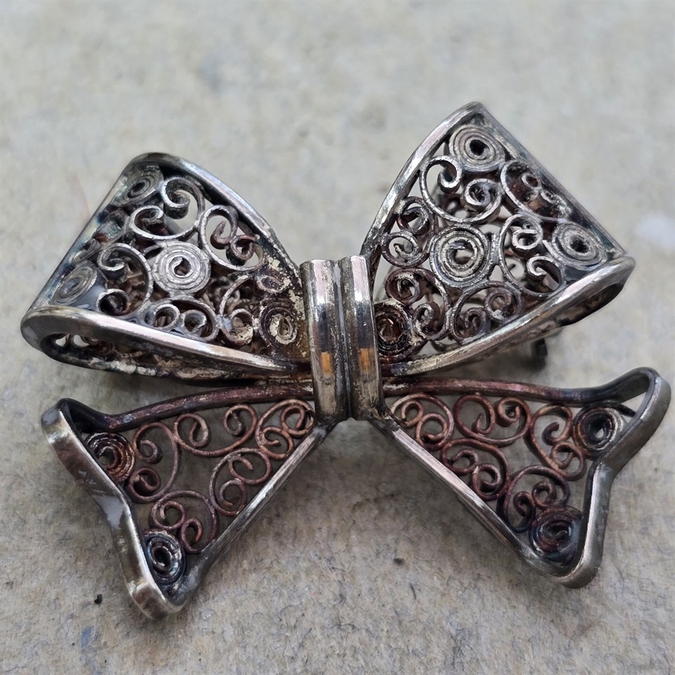 Opdag den udsøgte elegance med vores 'Sløjfe broche i sølvfarvet filigran, vintagebroche', en ægte perle af klassisk finesse og aristokratisk charme.