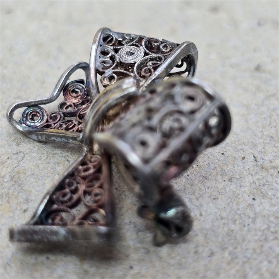 Denne fortryllende broche er omhyggeligt udformet i delikat sølvfarvet filigran, hvilket giver et indtryk af raffineret luksus og tidløs skønhed. Med en imponerende bredde på 3 cm., tilføjer denne vintagebroche et strejf af majestætisk glamour til enhver garderobe.