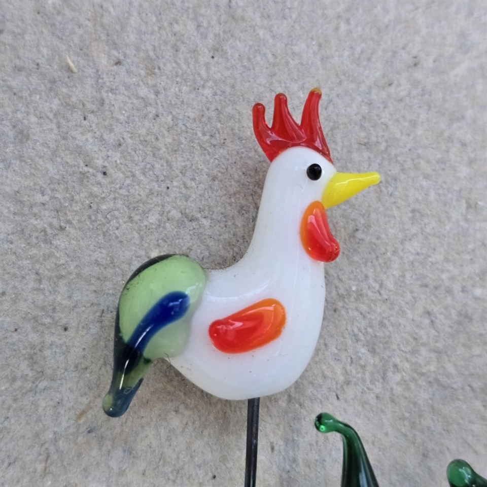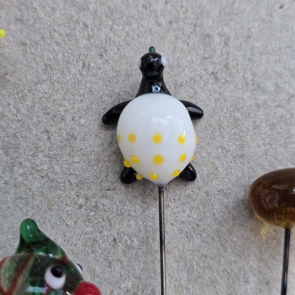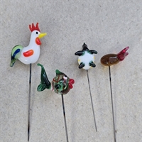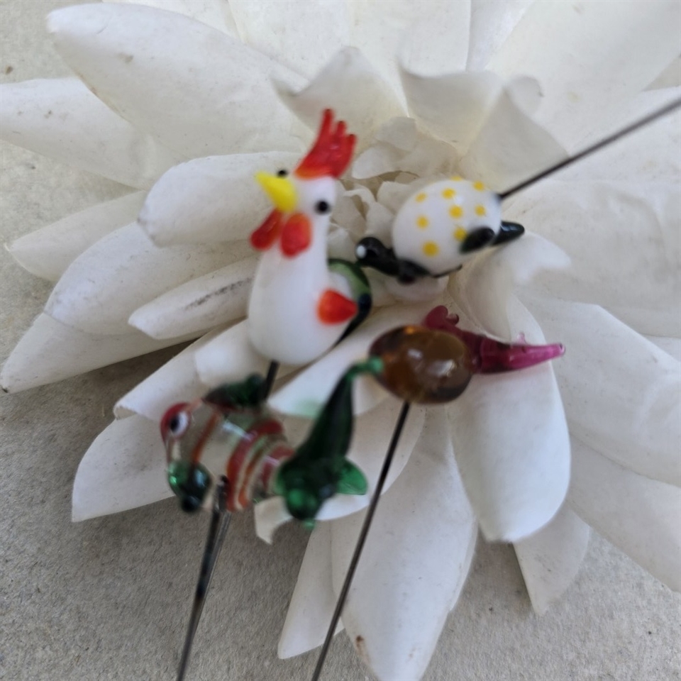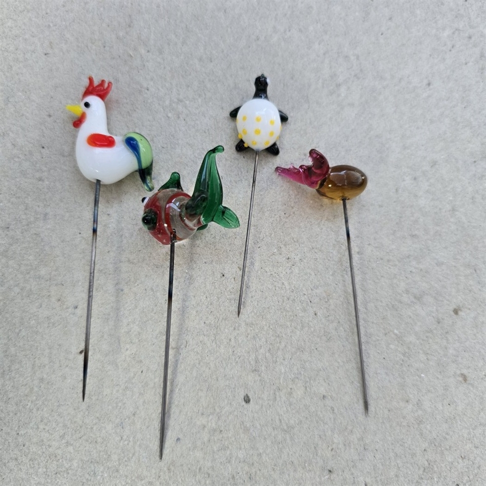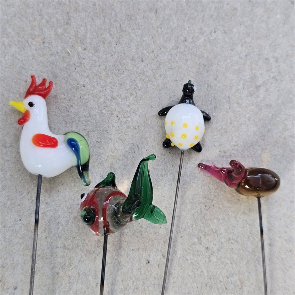 Se skønheden og charmen i vores unikke sæt af 'Slørhale, hane, skildpadde + gamle glas nipsenåle'.