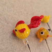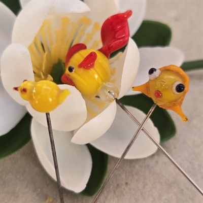 Fra den livlige gule slørhale med røde finner til det detaljerede hoved med rottehaler og den nuttede kylling med sit røde næb, er hvert stykke en lille kunstværk.