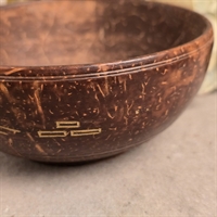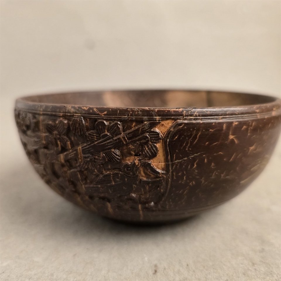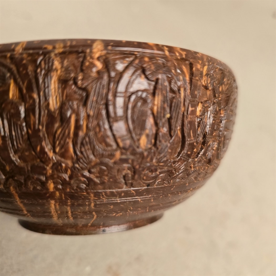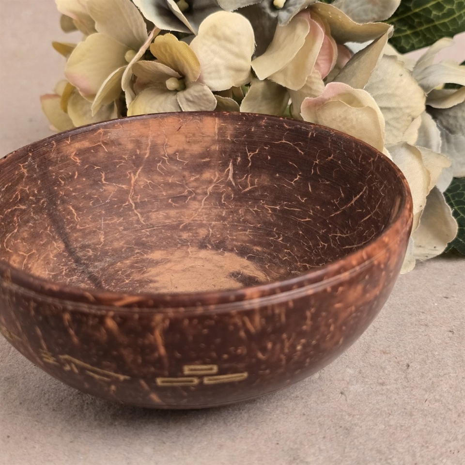Denne unikke lille skål er omhyggeligt udskåret fra en ægte kokos nøddeskal, hvilket gør hver eneste en helt speciel. Skålen er dekoreret med fine udskæringer af fugle og blomster, der tilfører et naturligt og kunstnerisk touch til din indretning.