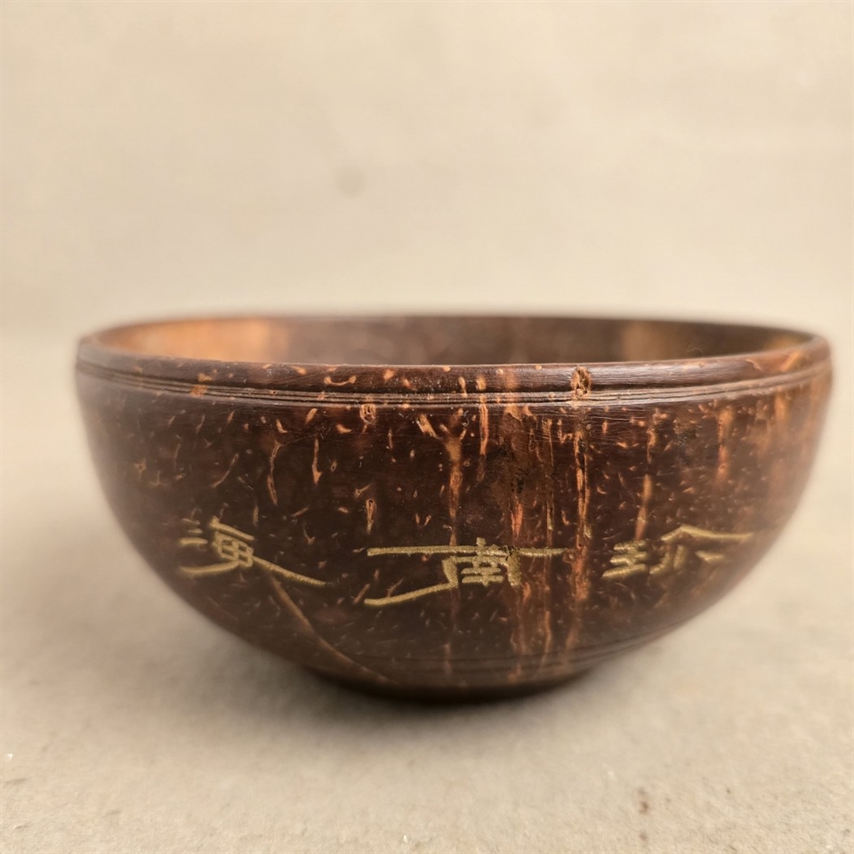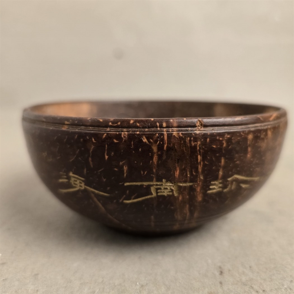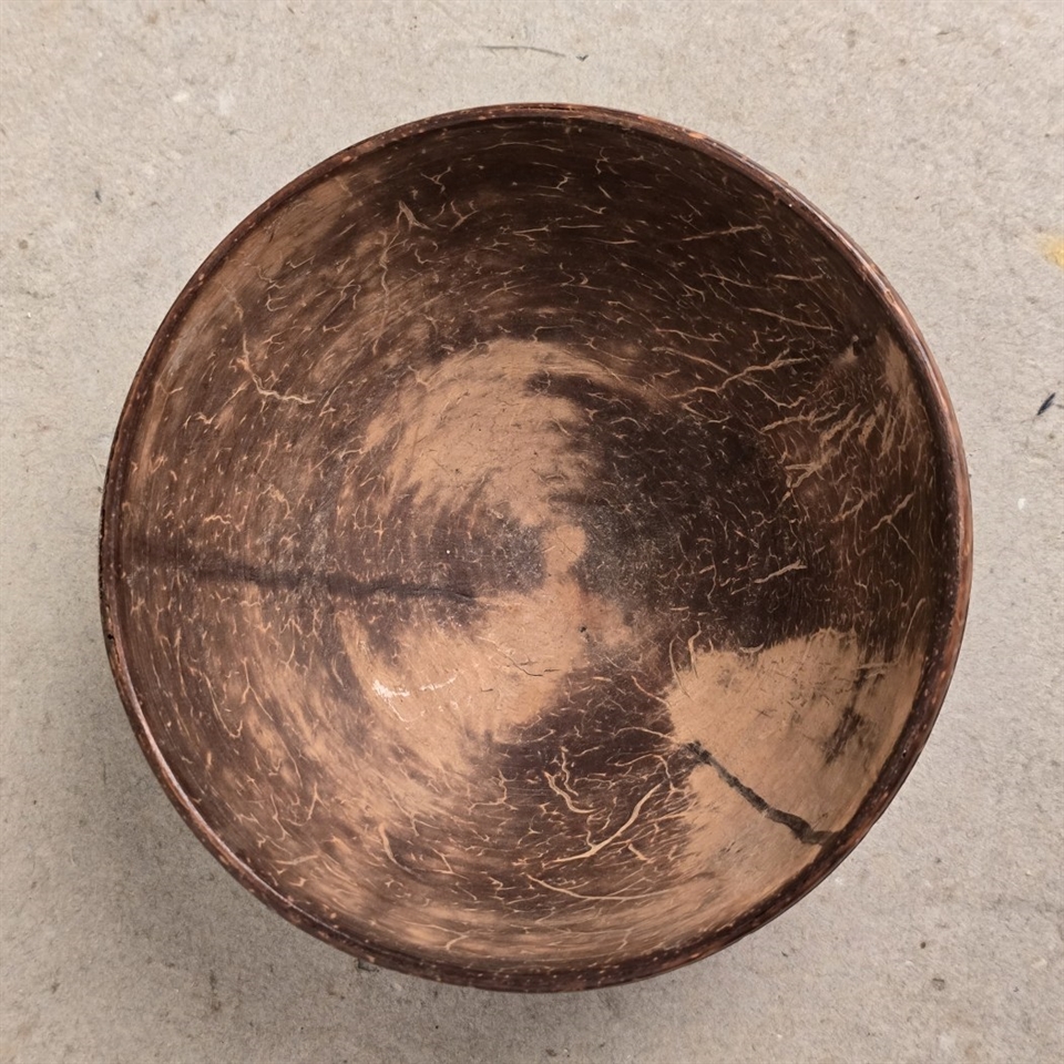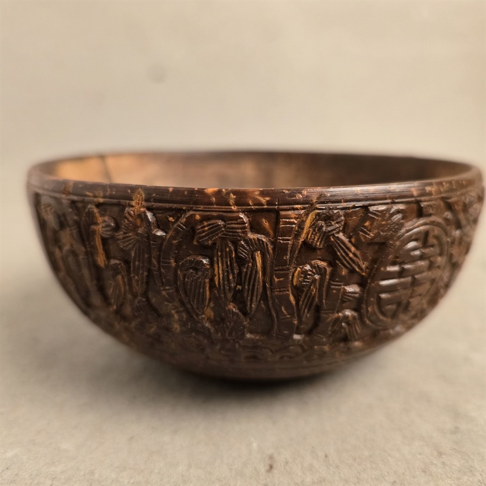 Denne unikke lille skål er omhyggeligt udskåret fra en ægte kokos nøddeskal, hvilket gør hver eneste en helt speciel. Skålen er dekoreret med fine udskæringer af fugle og blomster, der tilfører et naturligt og kunstnerisk touch til din indretning.