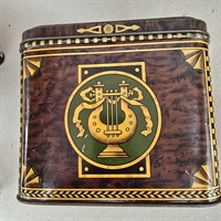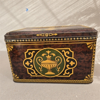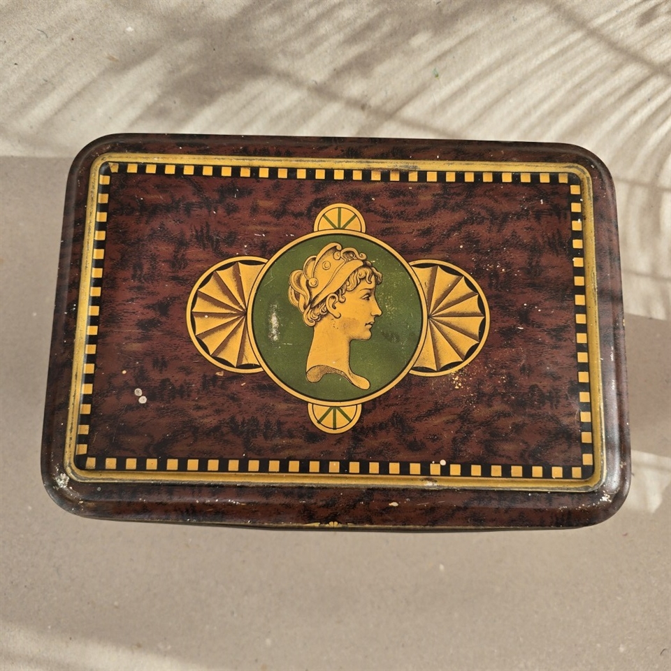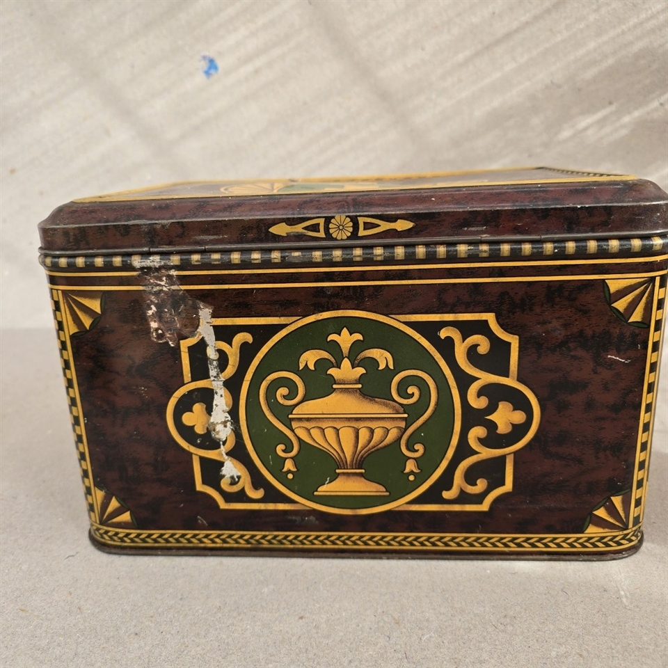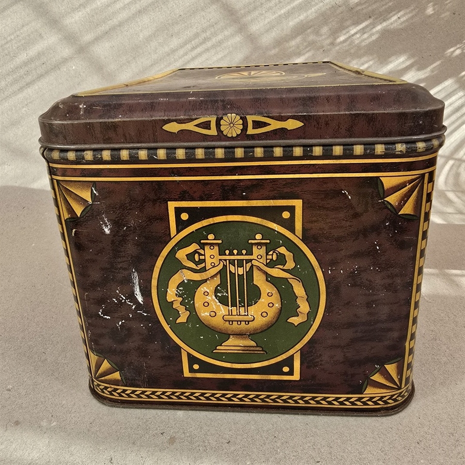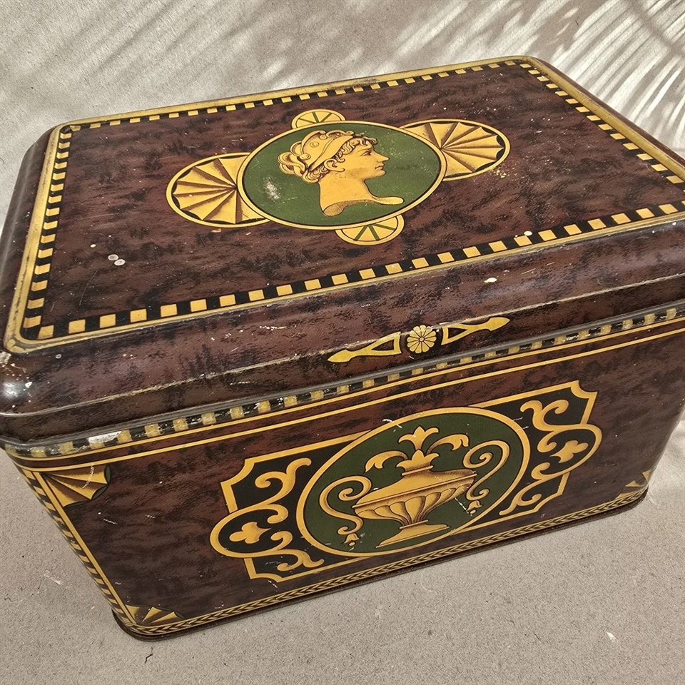Opdag den tidløse elegance og unikke charme med vores "Smuk dekoreret stor dåse, gammel blikæske". Denne eksklusive og prægtigt dekorerede metaldåse er en sand symfoni af klassisk skønhed og raffinement.