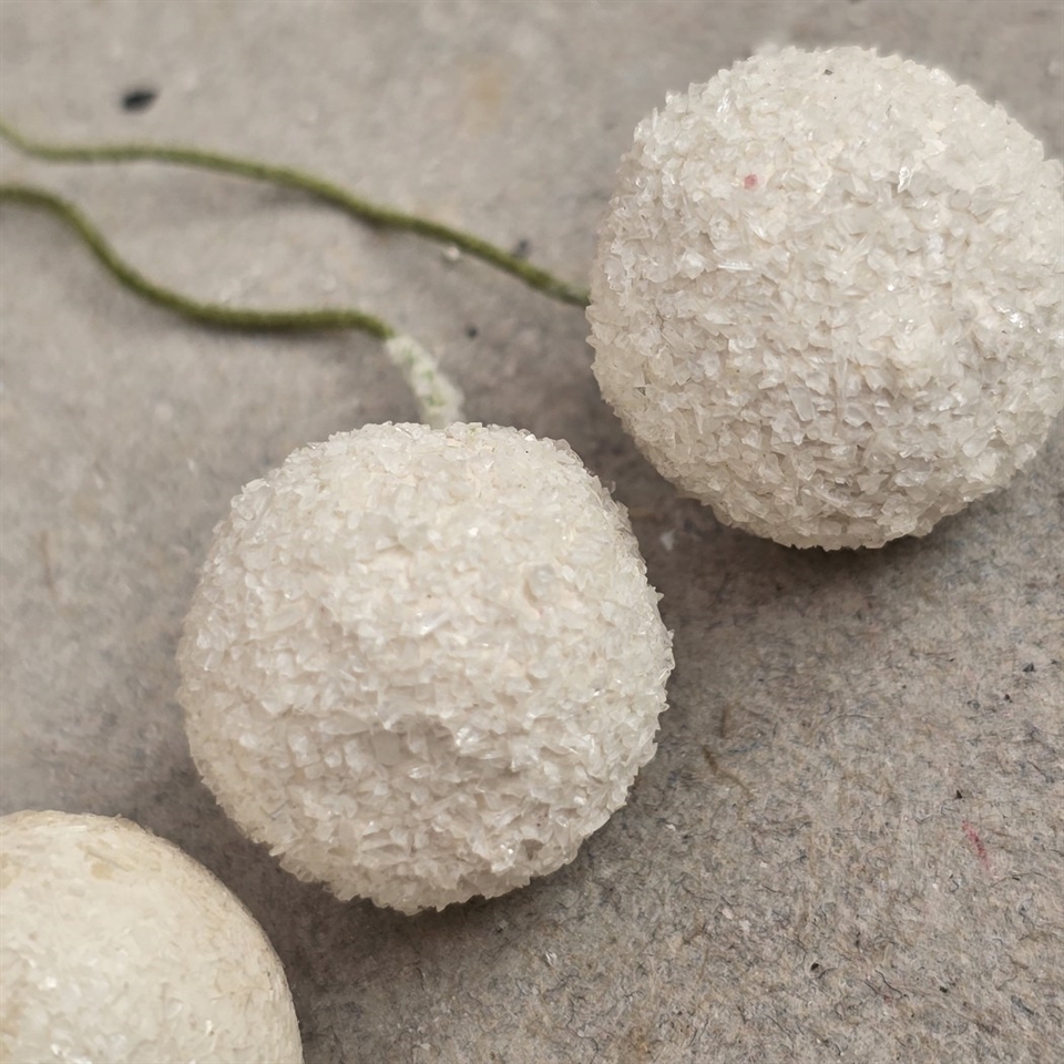 Hver kugle har en diameter på 18 mm. og er omhyggeligt dekoreret med fint, hvidt sukkerpynt, der glimter betagende, når julelysene fanger dem.