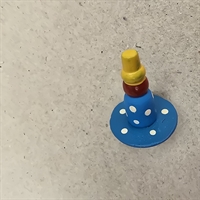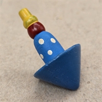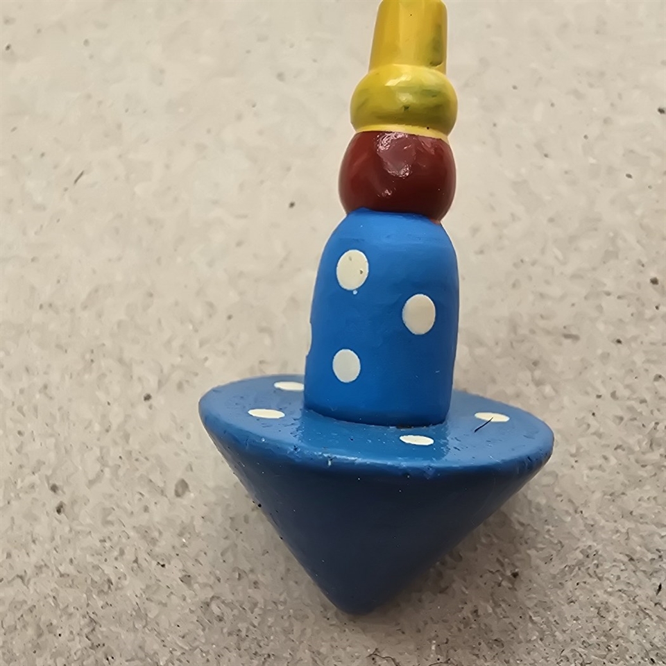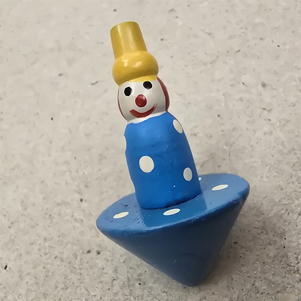 Snurretoppen står 5,5 cm. høj og er prydet med en glad klovnefigur, der har et smilende ansigt, en strålende gul hat og en livlig blå krop, som uden tvivl vil fange børnenes opmærksomhed.