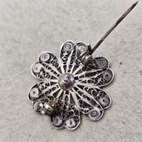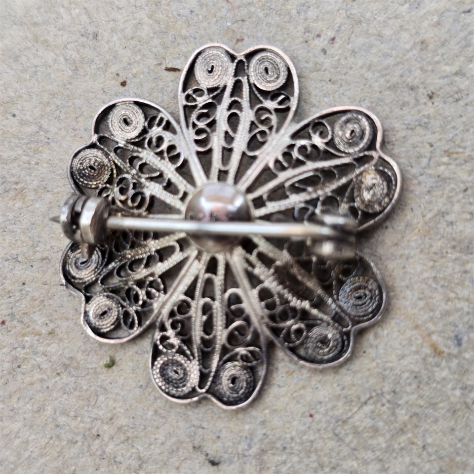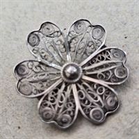 Opdag den udsøgte elegance og vintagecharm med vores 'Sølv filigran blomsterbroche, gammel 925s.' Dette mesterværk af håndværk er udført med en imponerende præcision, der kun findes i ægte filigranhåndværk.