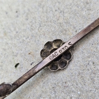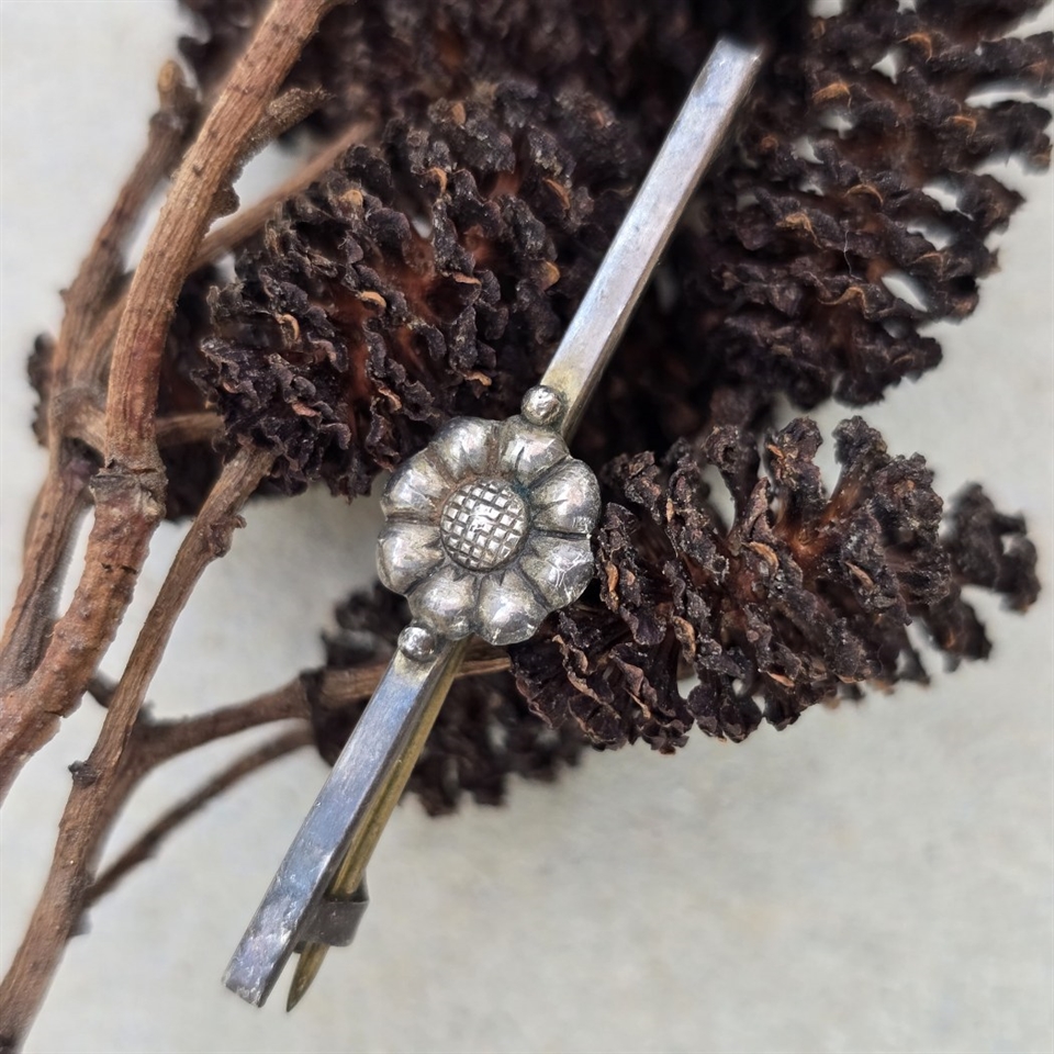 Opdag den tidløse elegance og forfinede skønhed med vores eksklusive 'Sølv nål med blomst midt på, vintagebroche'. Denne imponerende broche er udført i 830s sølv, der tilføjer en antydning af aristokratisk charme til ethvert outfit.