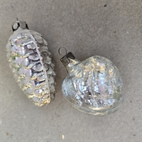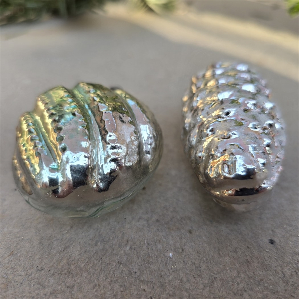 Opdag magien ved en klassisk jul med vores særlige sæt af 'Sølvfarvede gamle glas julekugler, hjerte og kogle'.