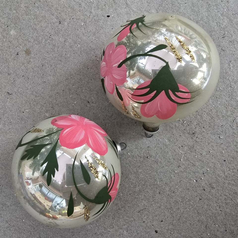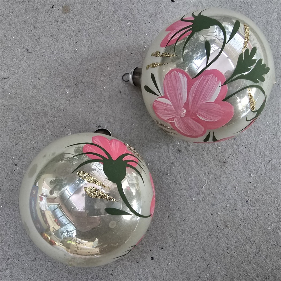Opgrader dit juletræ med et strejf af elegance og charme med vores 'Sølvfarvede glas juletræskugler med rosafarvede blomster'.