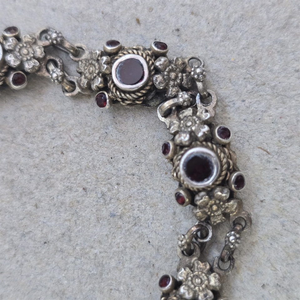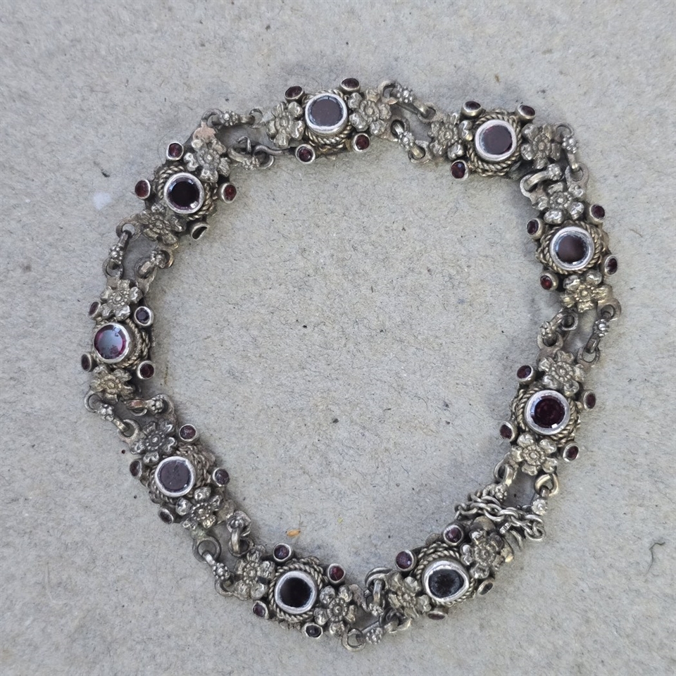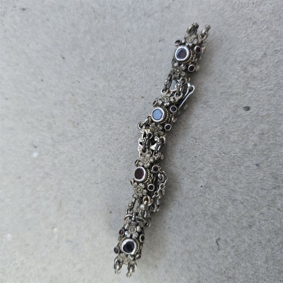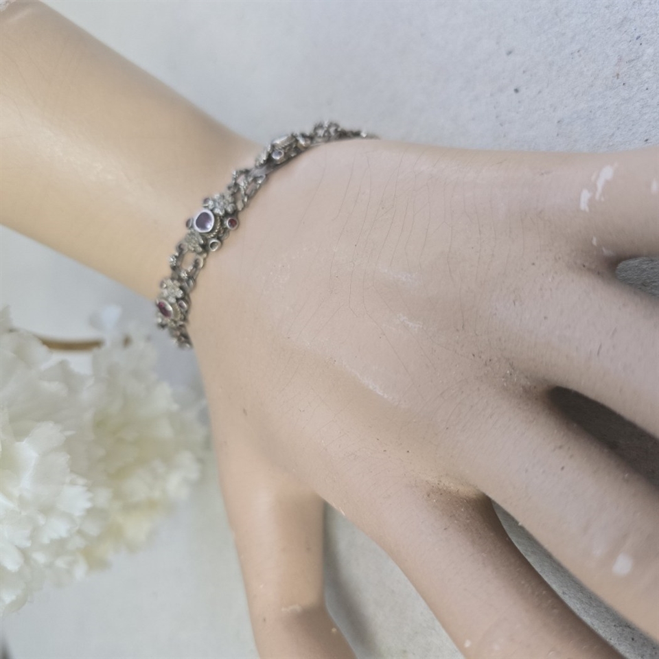 Opdag den tidløse elegance med vores 'Sølvfarvet armbånd med røde sten', som nu tilføjer et strejf af vintage-charme til din smykkesamling.