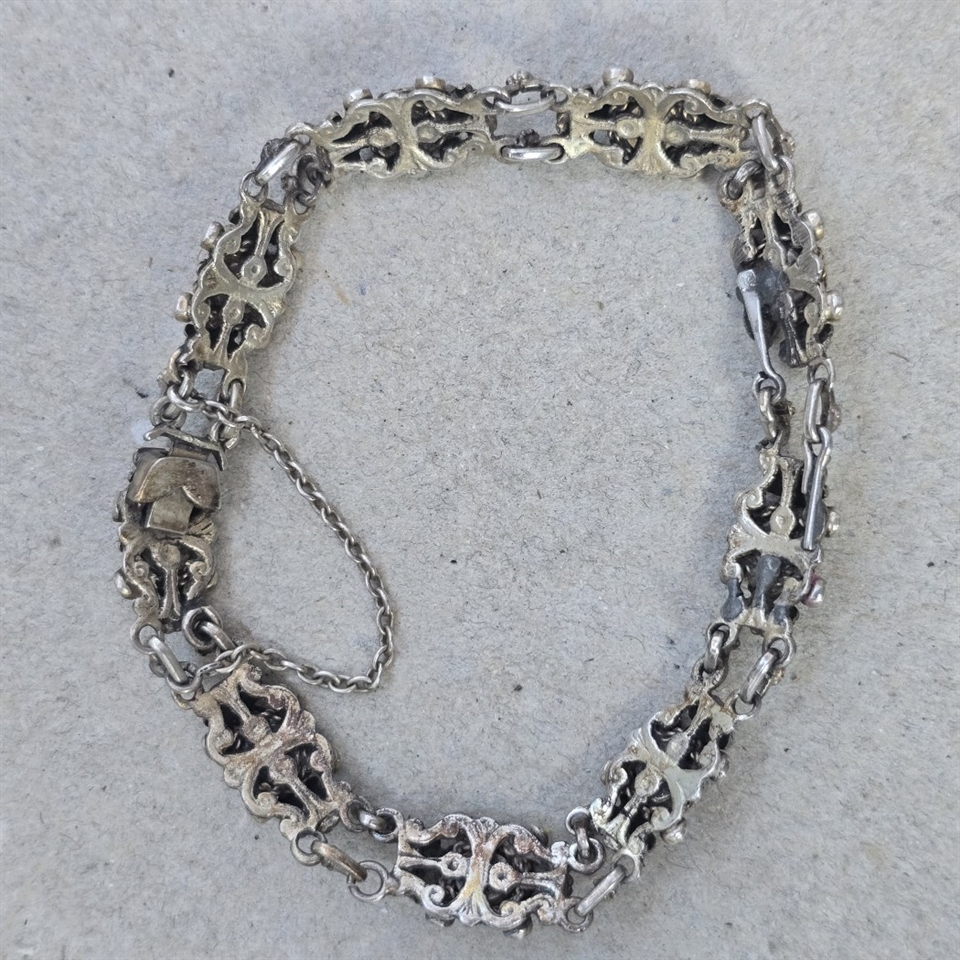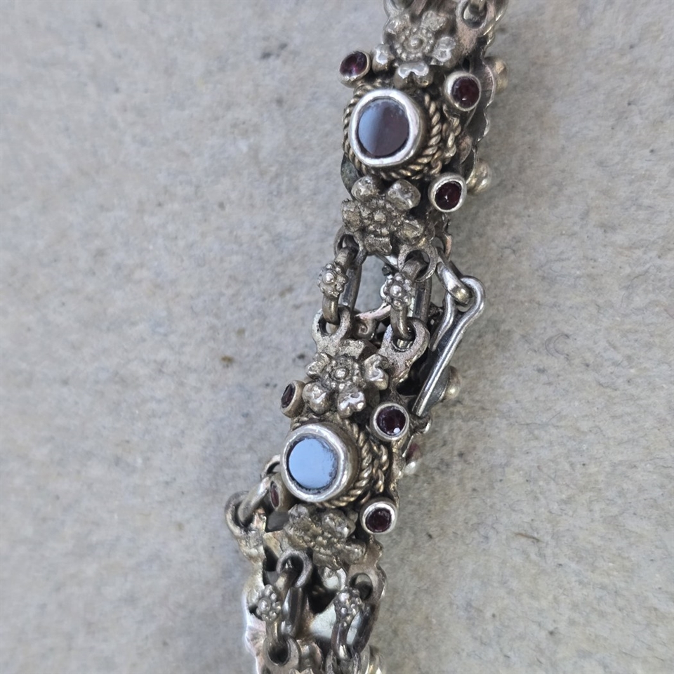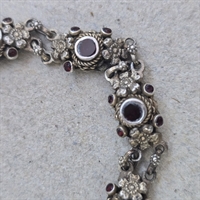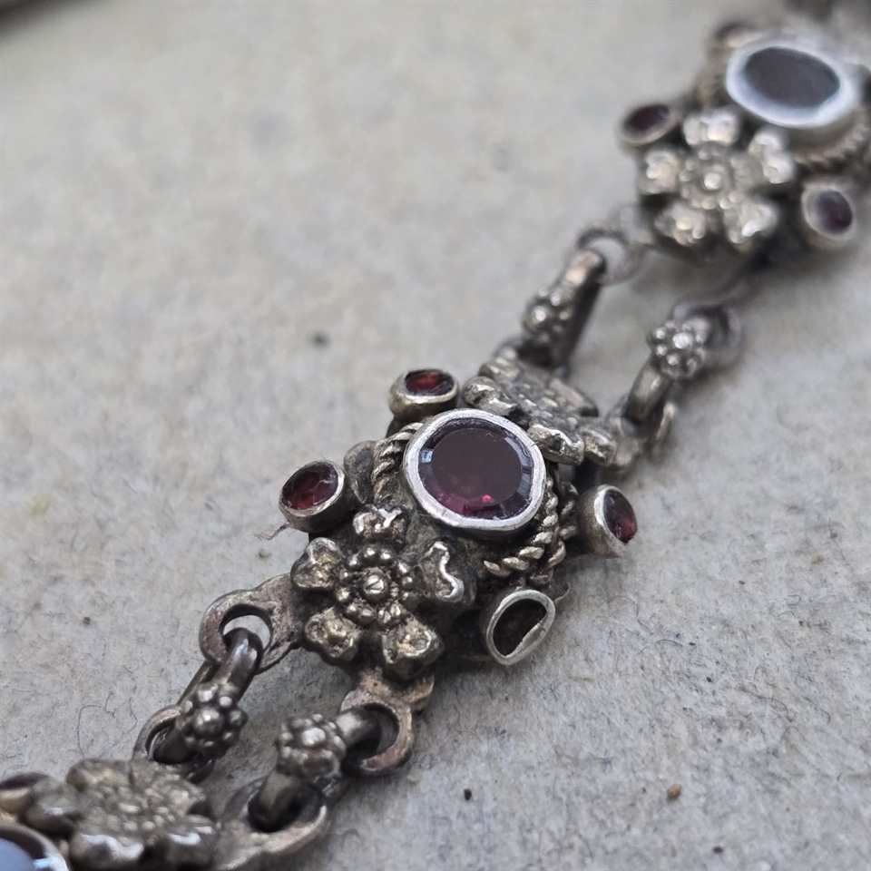 Opdag den tidløse elegance med vores 'Sølvfarvet armbånd med røde sten', som nu tilføjer et strejf af vintage-charme til din smykkesamling.