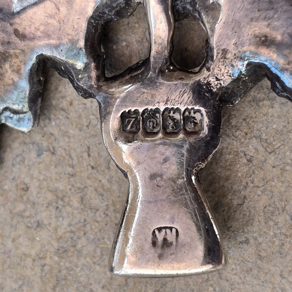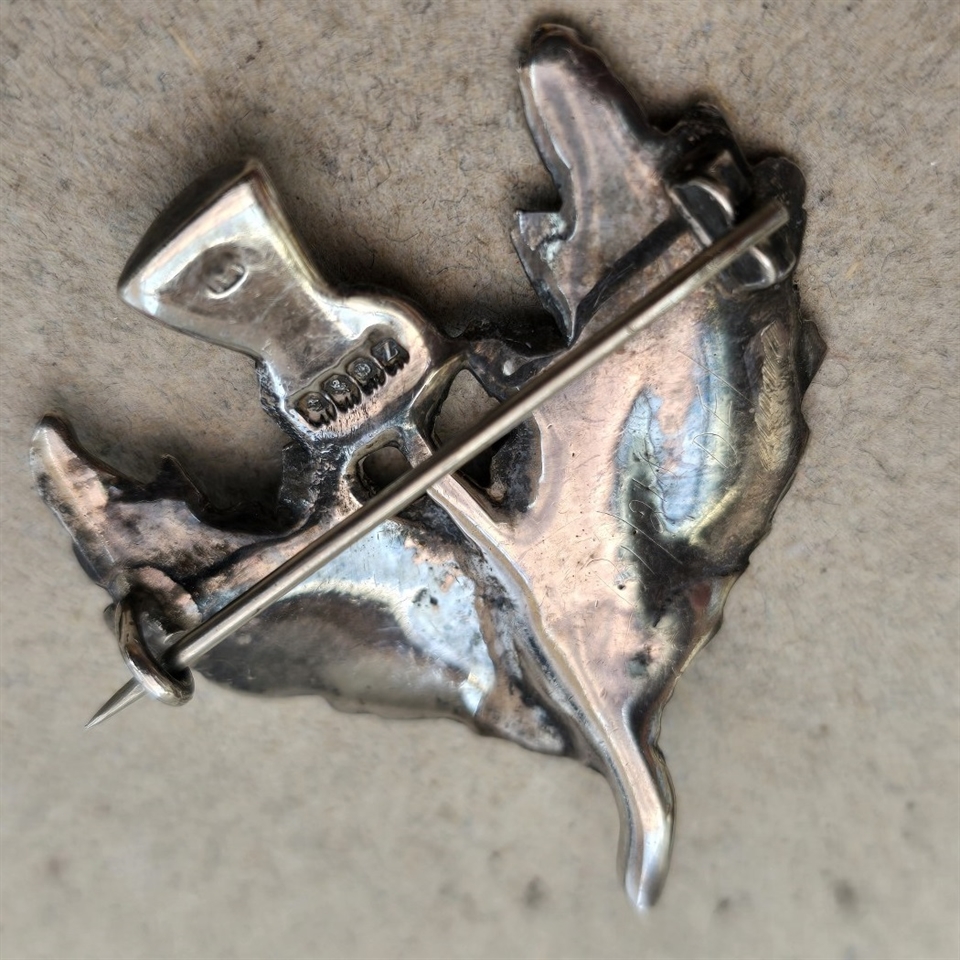 Dette vintage smykke, som måler 3,8 cm. i bredden, er en sand repræsentation af klassisk skotsk kunsthåndværk. Brochen er udført i et smukt sølvfarvet metal, der tilfører et strejf af aristokratisk charme og raffinement til enhver påklædning.