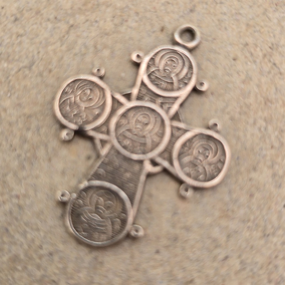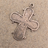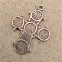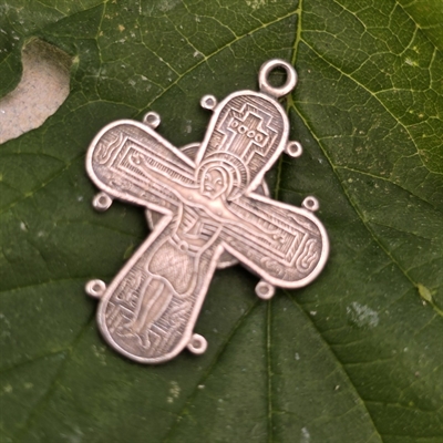 Dette forfinede vedhæng er formet som et kors, målende 2,5 x 2,1 cm., og fremstår med et indfældet Kristusmotiv, der tilføjer en dybde af kulturel og åndelig betydning.