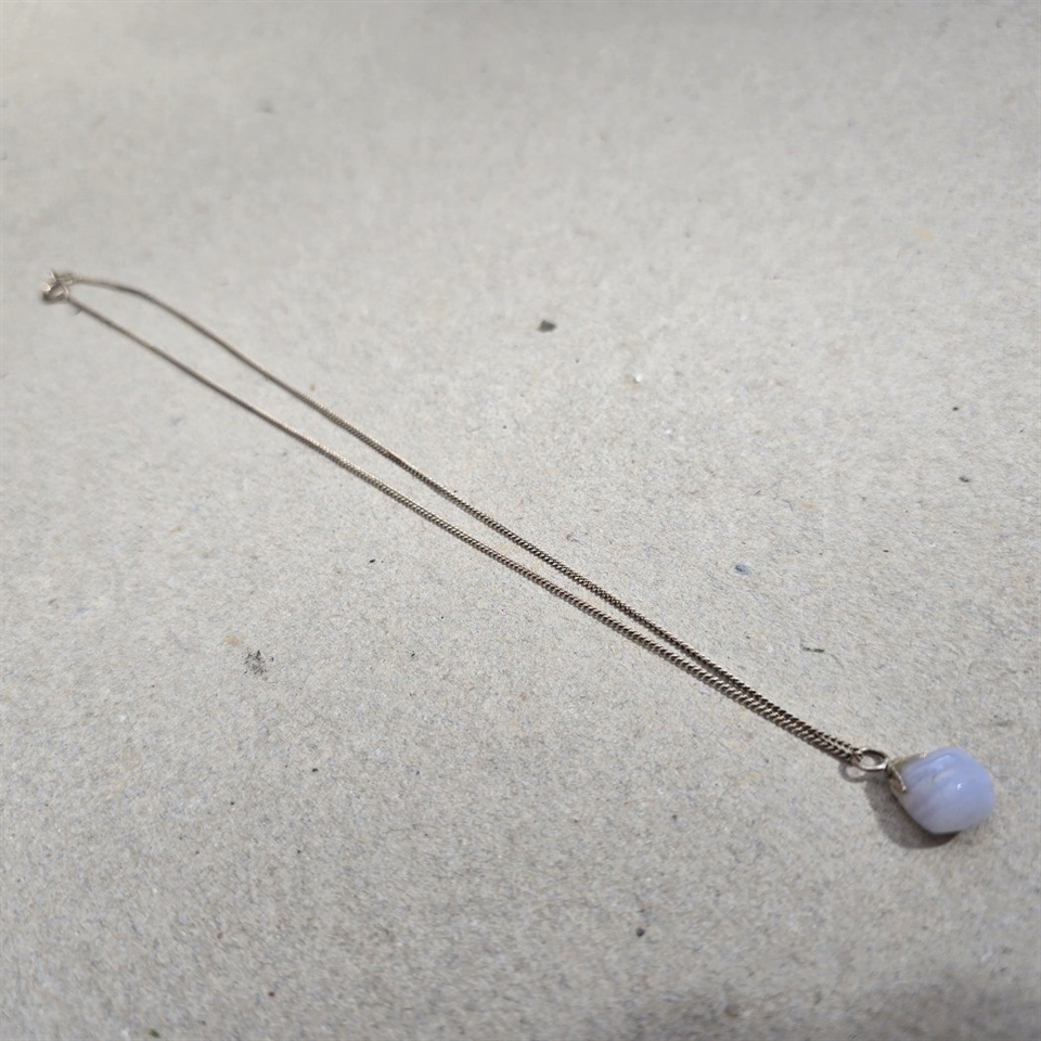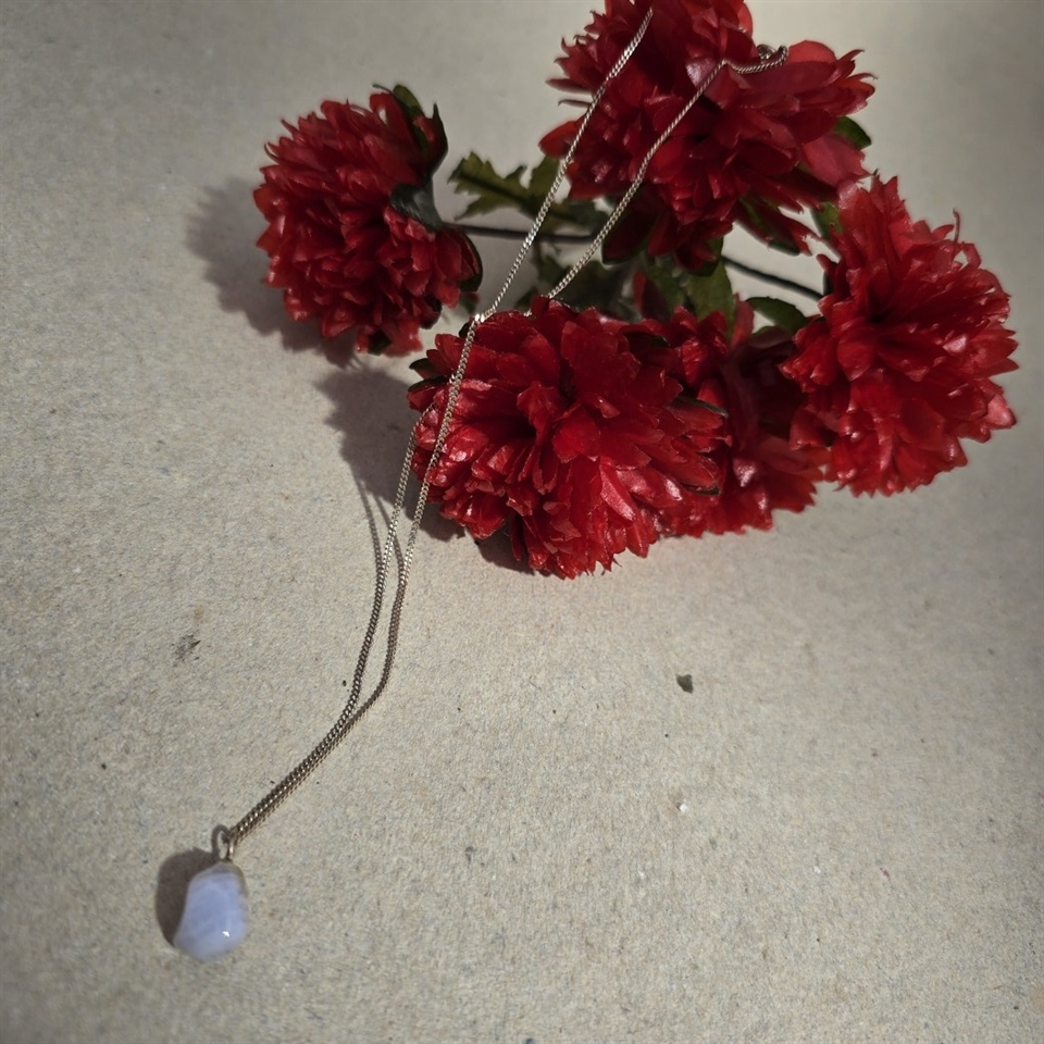 Opdag elegance og vintage charme med vores 'Sølvkæde med vedhæng af lyseblå sten, retro smykke'.