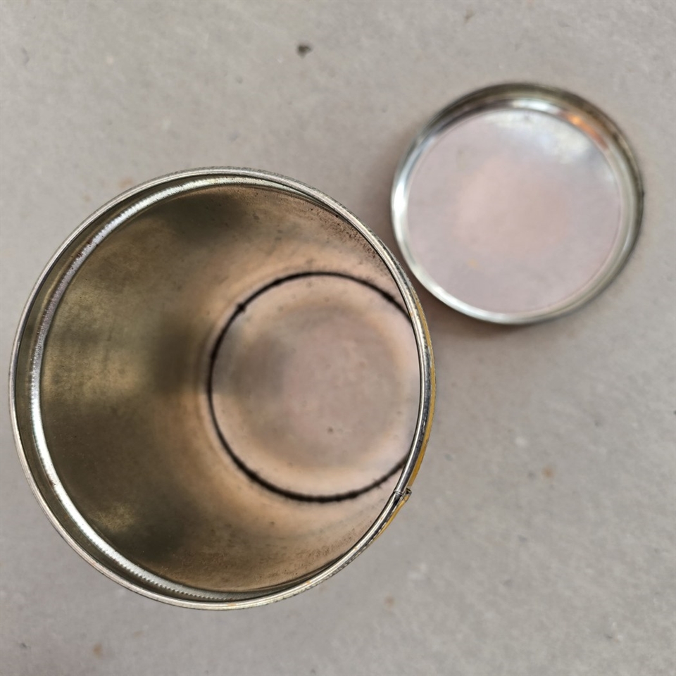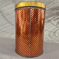 Med en imponerende diameter på 11 cm. og en højde på 17 cm., tilbyder denne blikdåse ikke kun praktisk opbevaring, men også et storslået visuelt indtryk.