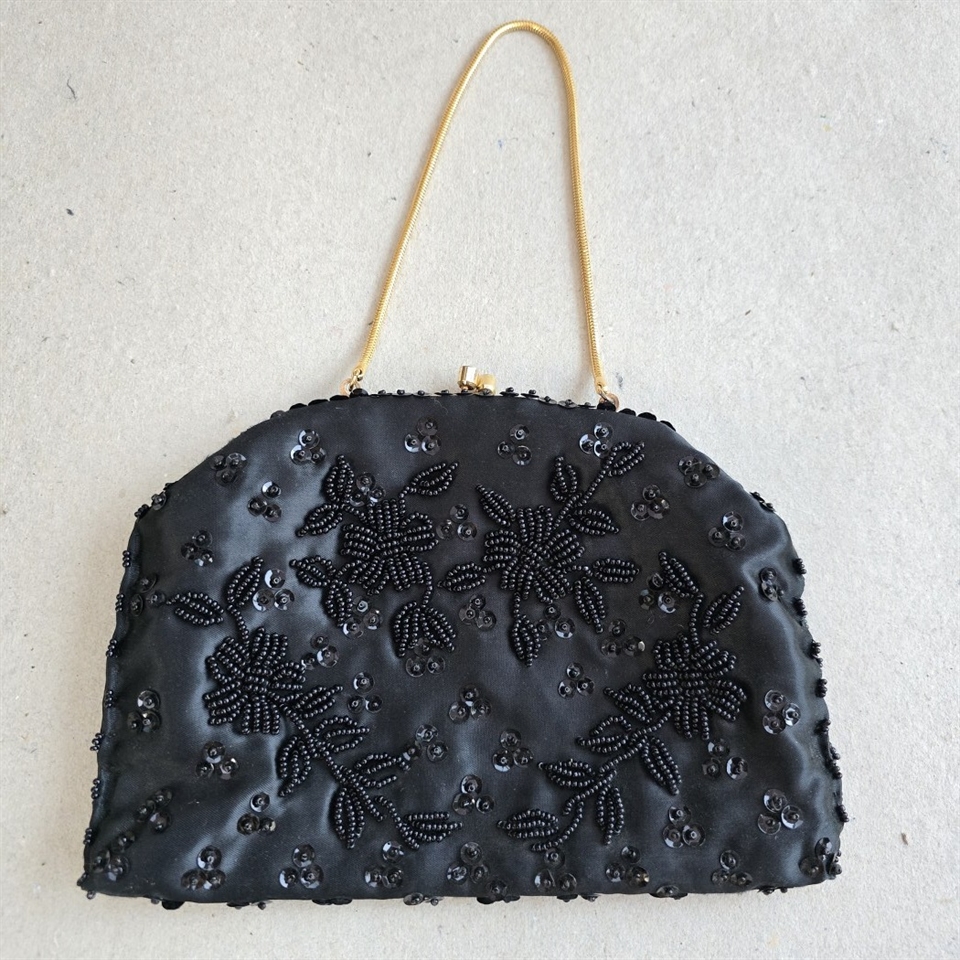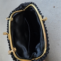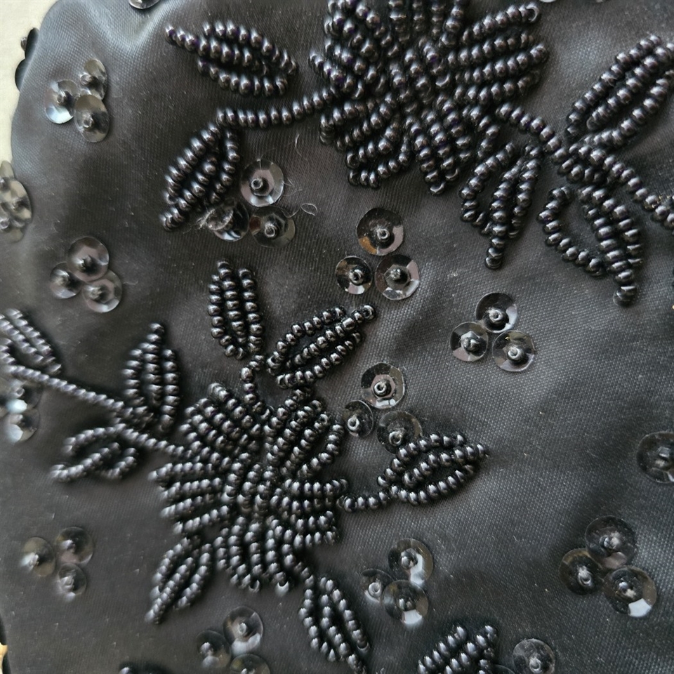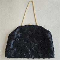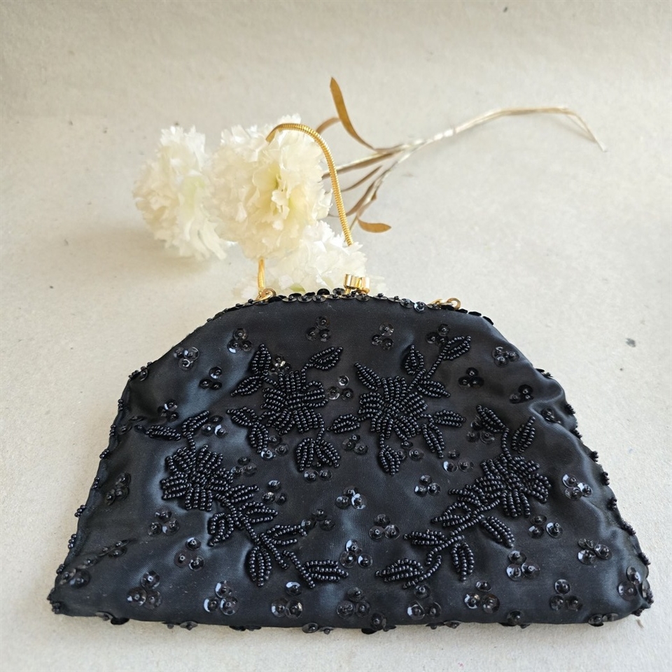Denne eksklusive håndtaske er fremstillet af sort satin og omhyggeligt dekoreret med delikat perlebroderi, der tilføjer et strejf af glamour og sofistikation til enhver aftenbegivenhed.