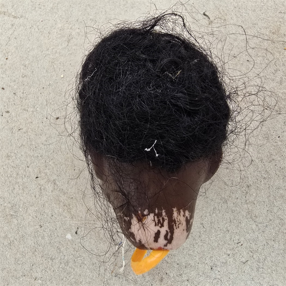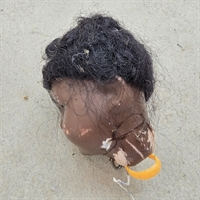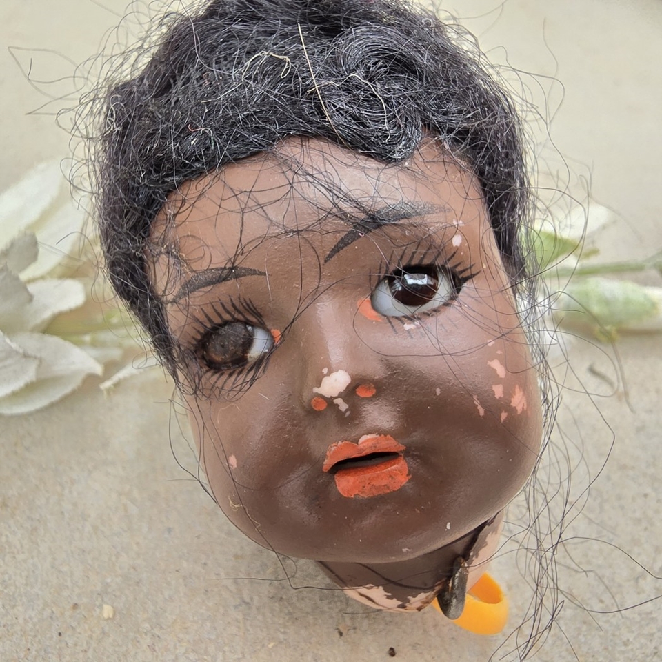 Opdag en unik skat til din samling med vores "Gamle Dukkehoved med Sort Hår". Dette charmerende dukkehoved er ikke kun et stykke legetøjshistorie, men også en kunstnerisk dekoration, der vil tilføje karakter og nostalgi til ethvert rum. Dukkehovedet står 6,5 cm. højt og fanger øjet med sit dybt mørklødede hudtone og livlige sorte hår.
