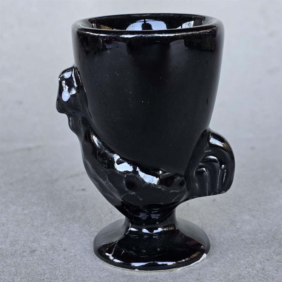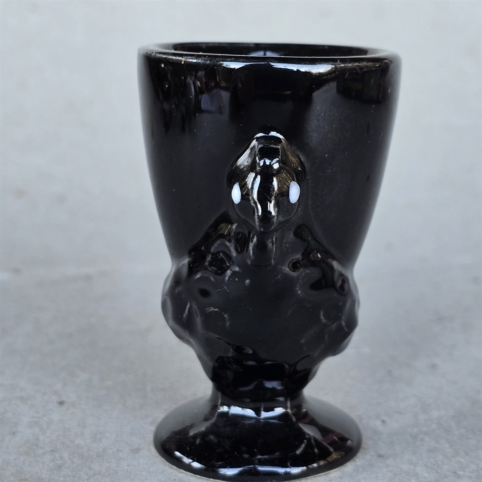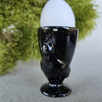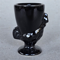 Opdag skønheden og unikheden i dette håndlavet 'Sort høne på sortglaseret keramik æggebæger på fod'.