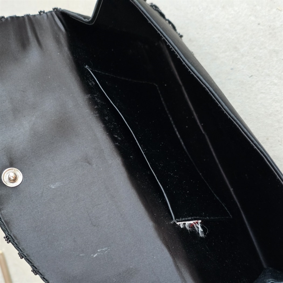 Fremstillet af sort satin, matcher denne taske enhver aftenkjole perfekt, og tilføjer en luksuriøs glans til dit outfit.