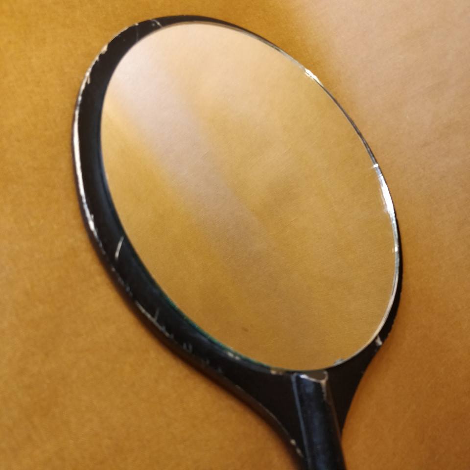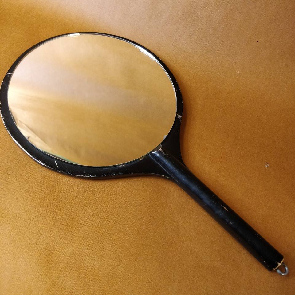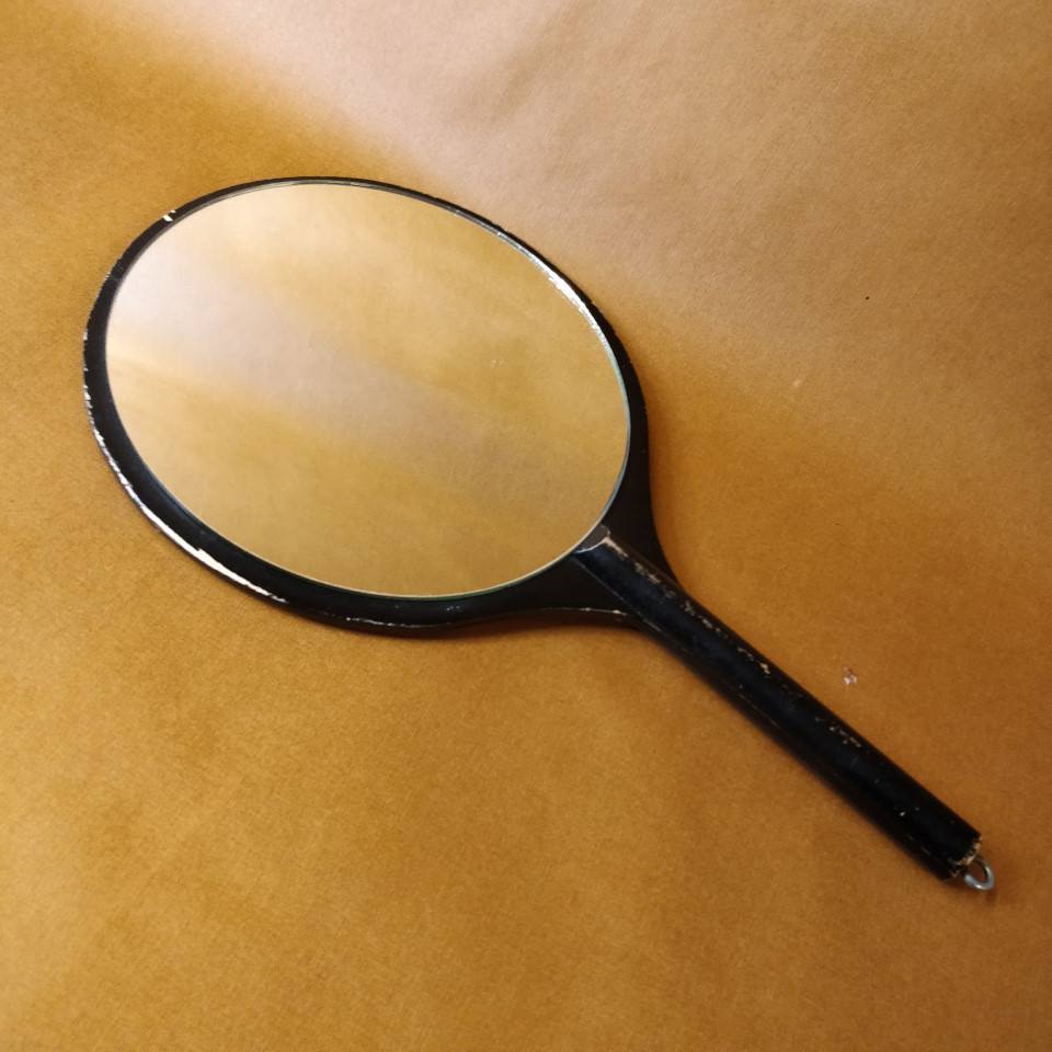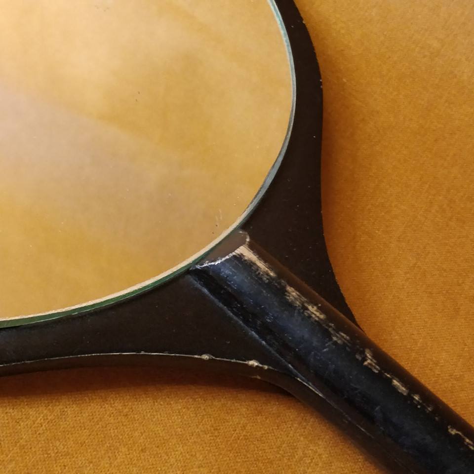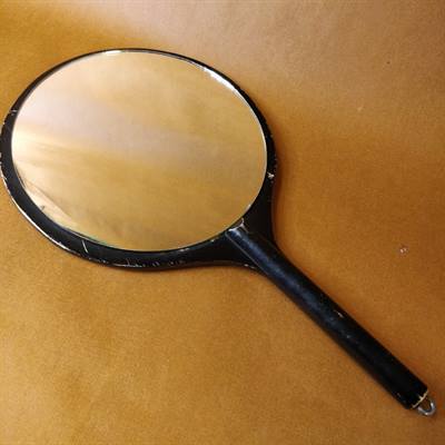 Gammelt håndspejl med spejle på begge sider. Sort træ håndtag.