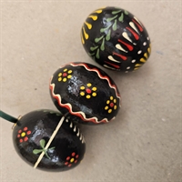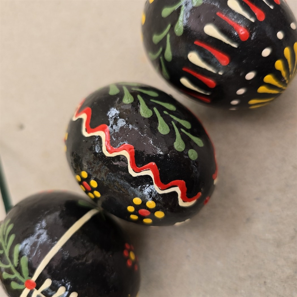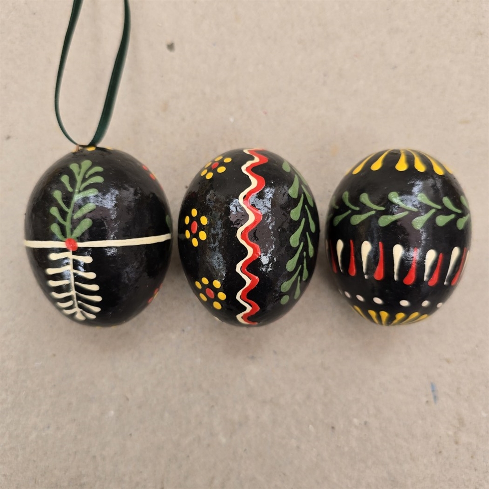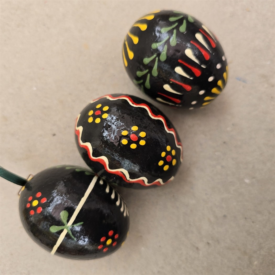 Opfrisk din påskepynt med et strejf af nostalgi! Vores unikke sæt af tre 'Sorte bemalede papmaché påskeæg' er den perfekte tilføjelse til din festlige dekoration.